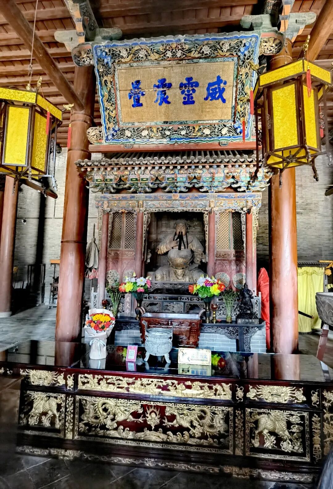 崇宁殿内,一尊高达八米的关公坐像俯瞰众生。塑像面如重枣,唇若涂脂,丹凤眼微睁,右手持《春秋》,左手捋长须,不怒自威。