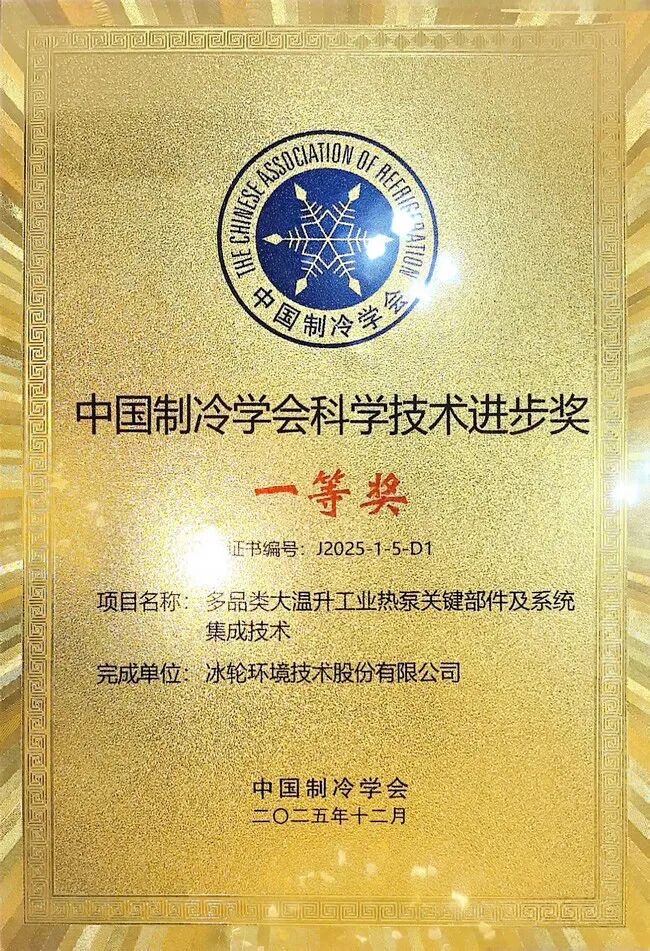 冰轮环境荣获2025年度中国制冷学会科学技术进步奖一等奖