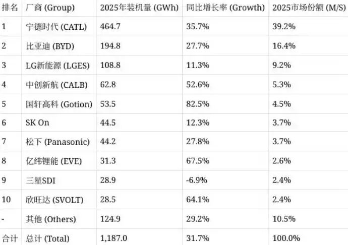 2025年,全球动力电池装机量前十名中,中国企业占据6席,市场总占有率超过70%,处于绝对的统治地位。