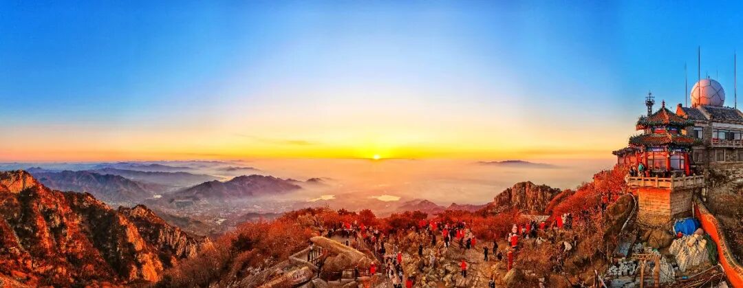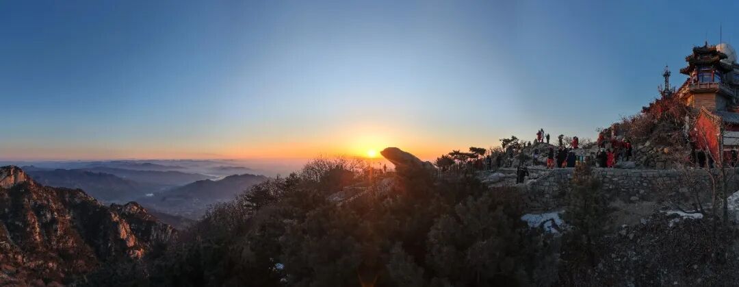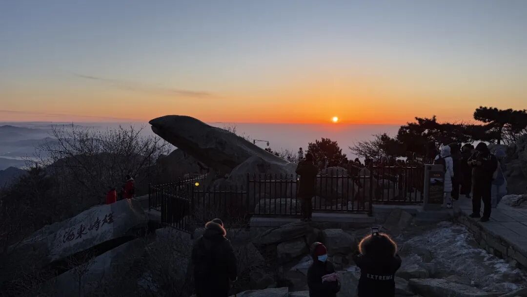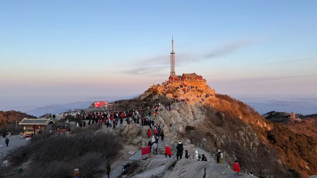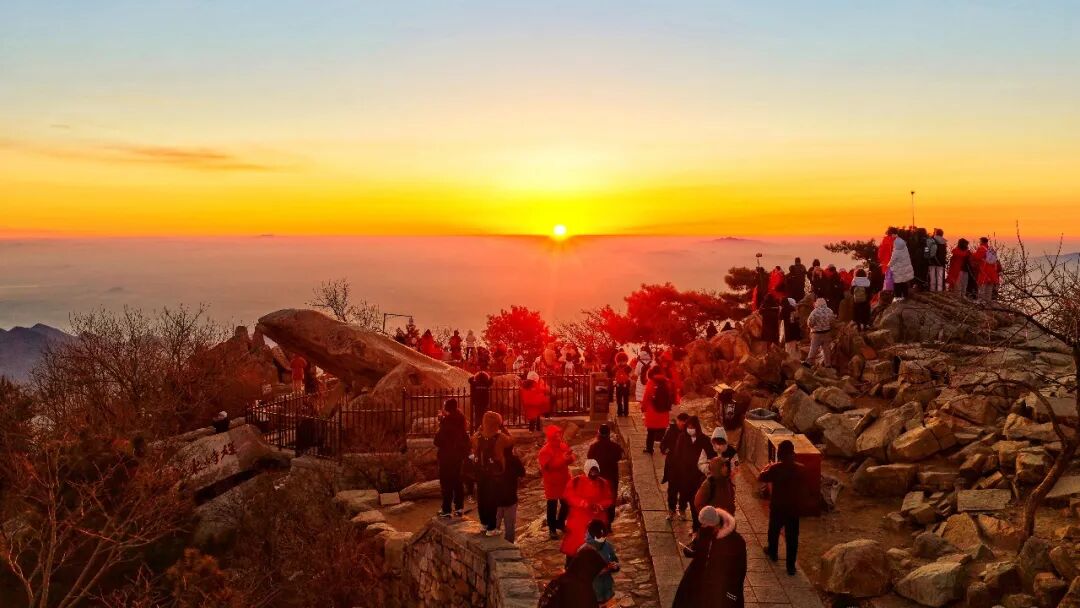 天刚蒙蒙亮,玉皇顶、拱北石等观日景点就已人头攒动,大家满怀期待等候新年曙光。红日缓缓升起,金色霞光洒满山峦,现场一片欢腾。