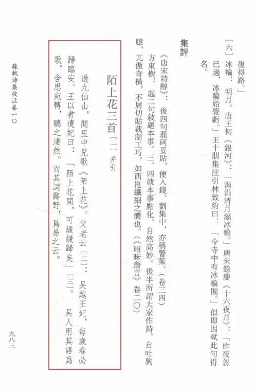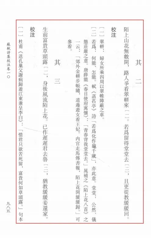 《苏轼全集校注》中有关《陌上花三首并引》的校注第二首诗着重写吴越王妃归临安时的场景:陌上山花无数开,路人争看翠軿来。若为留得堂堂去,且更从教缓缓回。第三首诗则借吴越王降宋史事抒写王朝兴衰。苏轼通过“草头露”“陌上花”等意象,隐喻富贵易逝、历史沧桑的主题。生前富贵草头露,身后风流陌上花。已作迟迟君去鲁,犹教缓缓妾还家。