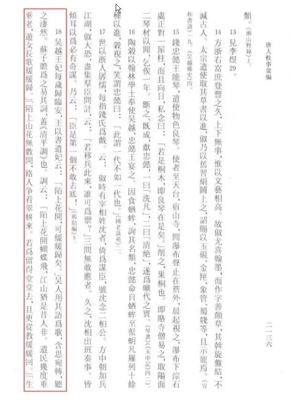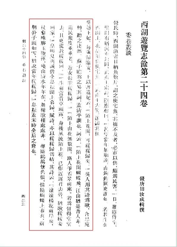 《吴越备志》涉武肃王夫人段落由此可见,此段与《十国春秋》相关记述几乎完全一致,清人吴任臣显然系节录《吴越备史》,之后叙及“夫人每岁春必归衣锦军以为恒,武肃王语之曰:‘陌上花开可缓归。’时人用其语以为歌曲,至今传之。”当为吴任臣参考宋、元、明时期相关史料自行撰写而成。在明代田汝成刊于嘉靖二十六年(1547)的辑著散文集《西湖游览志余》第24卷《委巷丛谈》部分,有对苏轼《陌上花三首》的相关记录:“吴越王妃,每岁归临安,王以书遗妃云:‘陌上花开,可缓缓归矣。’吴人用其语而歌,含思宛转,听之凄然。苏子瞻为之易其词,盖清平调也。调云:(以下引《陌上花三首,今略)”。虽然田汝成并未标明此处吴越王鏐耶?俶耶?但不知有意无意间,在此段前后段落均为所辑武肃王轶事,故很容易让读者联想“陌上花开”作者为钱鏐。