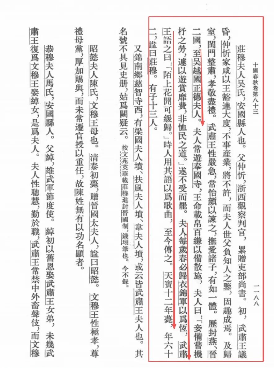 《苏轼全集校注》陌上花三首诗序苏轼诗叙中只是言及吴越王,但并未明确指向到底是哪位吴越国王,是爷爷钱鏐还是孙子钱弘俶?这就给后人解读留下巨大的解读空间。在吴越末代国王钱俶之弟钱俨托名所作的《吴越备史》⑦中,述及武肃王钱鏐夫人时,有以下记载:“历封燕、晋二国,至吴越国正德夫人。夫人将游奉国寺,王乃命帛百匹以备施散,夫人曰:‘妾备尝机抒之劳,遽以游赏费之非,非念人之道。’遂不受而罢,其仁慈节俭如此。”