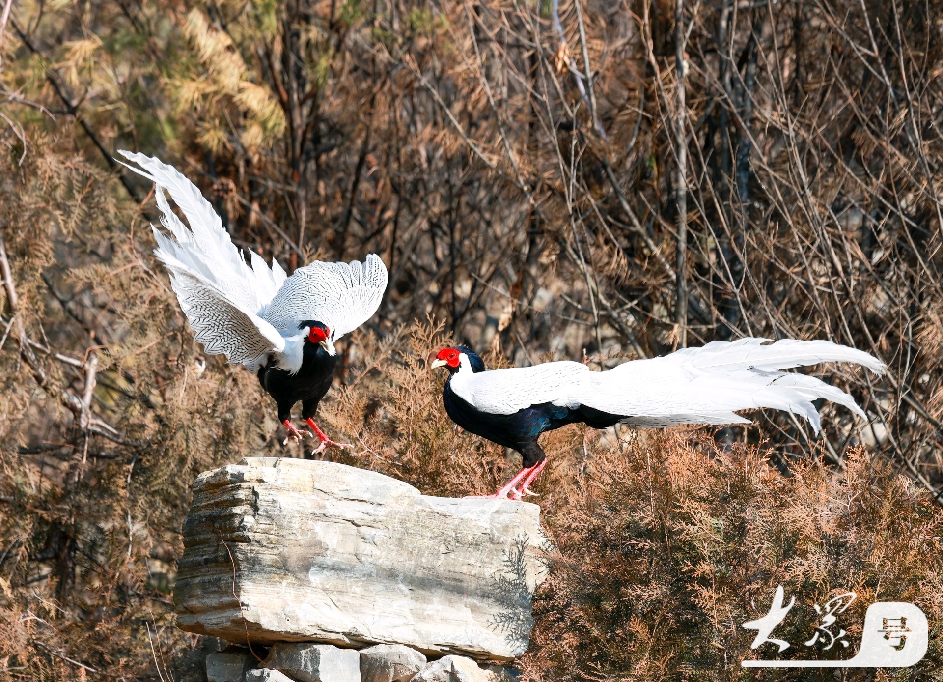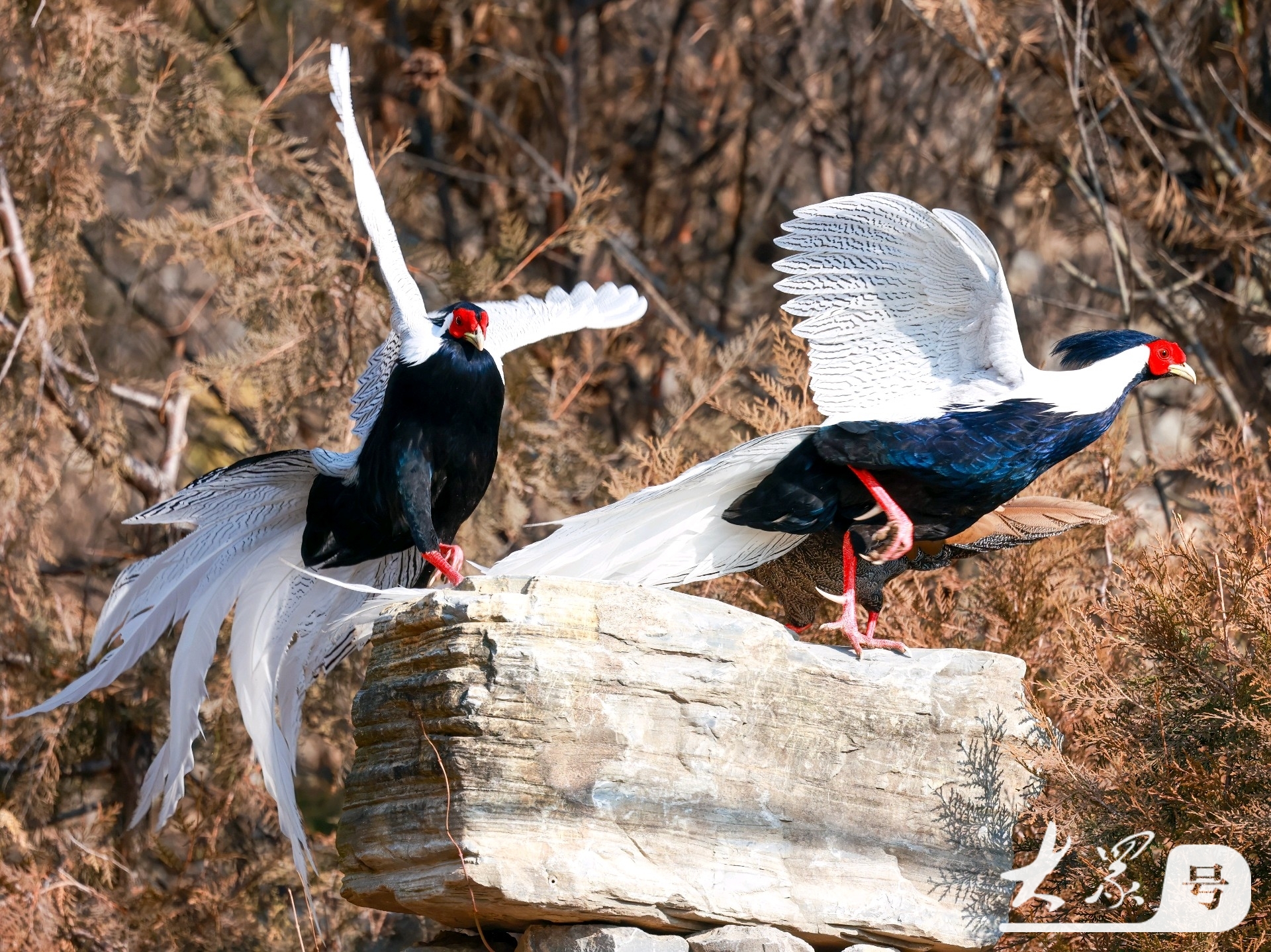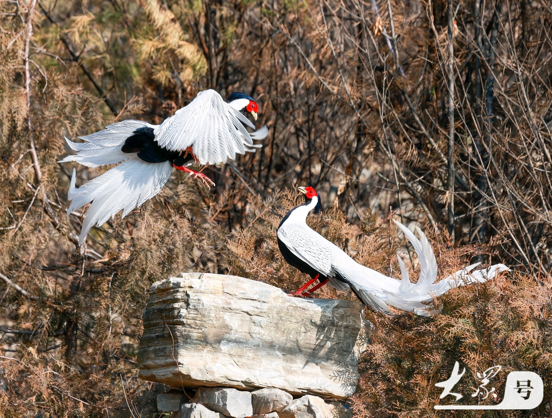 这场面不仅充满力量感,更有一种惊心动魄的美感。雄白鹇本就体态优雅,一身黑白分明的羽毛搭配赤红的脸颊,在争斗时,它们舒展双翼,长长的尾羽随风摆动,原本静谧的“仙气”瞬间转化为昂扬的斗志,这一动一静的反差,确实是大自然最精彩的瞬间 。