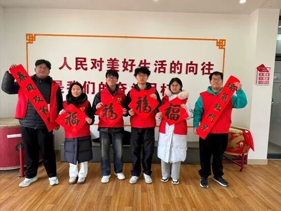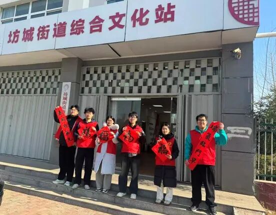 国际交流学院筑梦实践小队来到潍坊市坊子区坊城街道文化站开展了一场“迎新春、送万福”文化下乡社会实践活动。活动现场,团队成员们热情地为老师们铺纸、研墨,书法家协会的老师们挥毫泼墨,笔走龙蛇,一副副寓意吉祥的春联、一个个饱含祝福的“福”字跃然纸上。大家将写好的春联和福字送到居民手中,并向他们送上新春的问候,红彤彤的春联和福字映照着居民们一张张笑脸。活动为坊城街道的居民们送去了新春的祝福和浓浓的年味,更让同学们体会到中华优秀传统文化的魅力与价值。