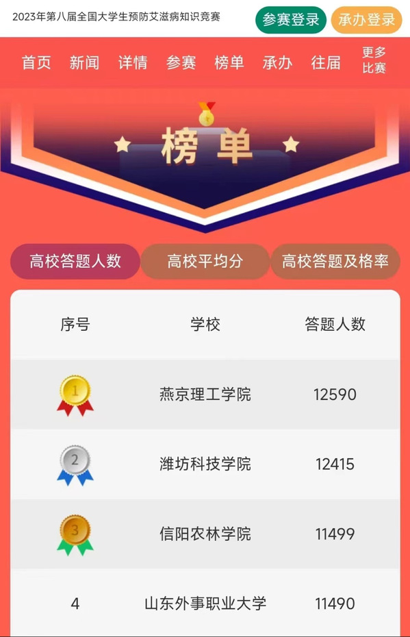 据悉,本次大赛由国家疾控局传防司和教育部体卫艺司指导,中国预防性病艾滋病基金会与中国性病艾滋病防治协会主办,旨在通过网络知识竞赛和预防艾滋病宣传两项活动,提高广大师生对艾滋病的正确认识及自我防护意识,预防和减少艾滋病在学校的传播。山东外事职业大学通过观看视频、悬挂横幅、知识宣讲、主题游园会等多种形式广泛宣传艾滋病预防知识,积极组织学生报名并参与网上答题活动,参与学生高达11490人,在全国高校答题人数排行榜位列第四名。