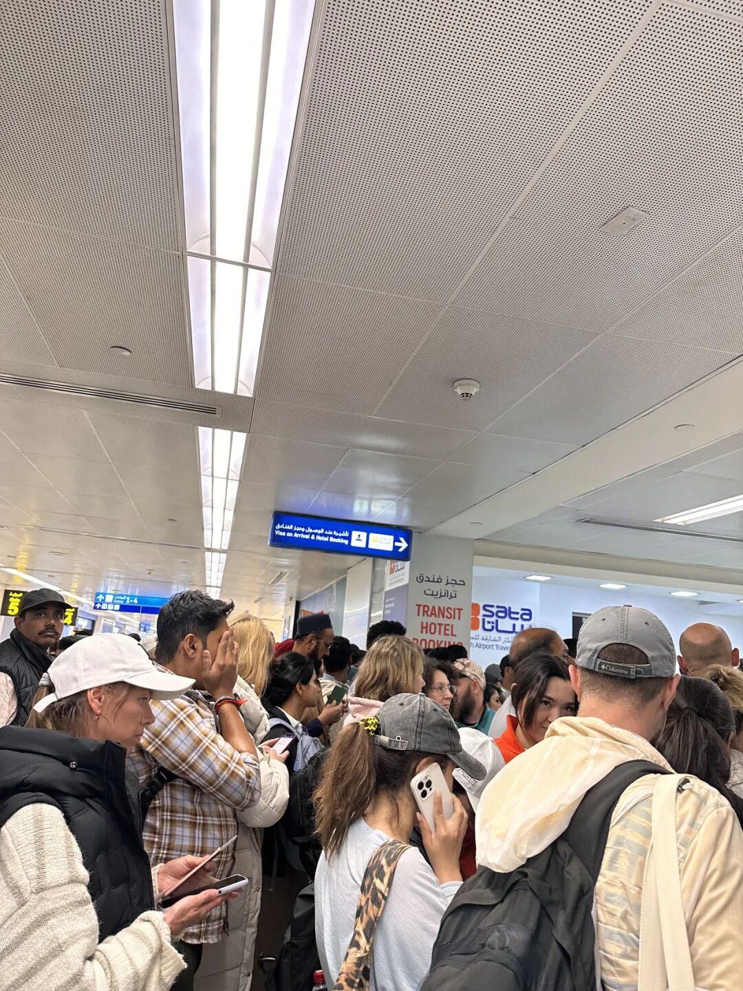 候机厅里,情绪开始发酵,带插头的座位全被人占了,还有人和工作人员发生争吵。门门曾向一位当地官员询问,对方表示有阿联酋ID可以走,但没有就不能离开。门门反复沟通,对方犹豫了一下说“那好吧”——仿佛这事可以商量。但从候机厅走到到达厅,门门以为可以走了,结果到达厅里挤满了人,全是被困的旅客。大家围着工作人员理论,对方还是那句话:等移民局介入。