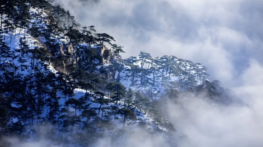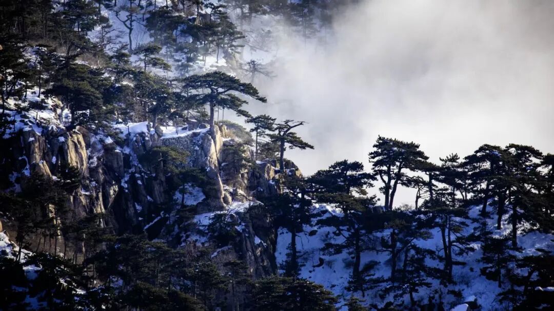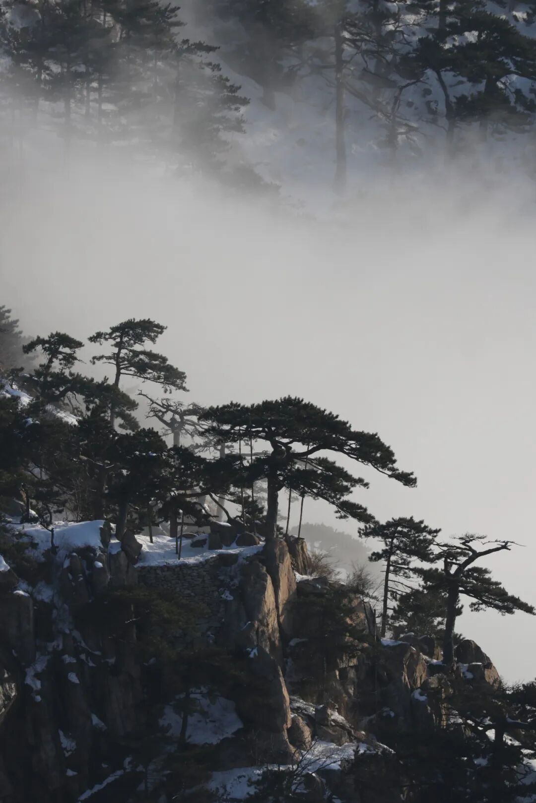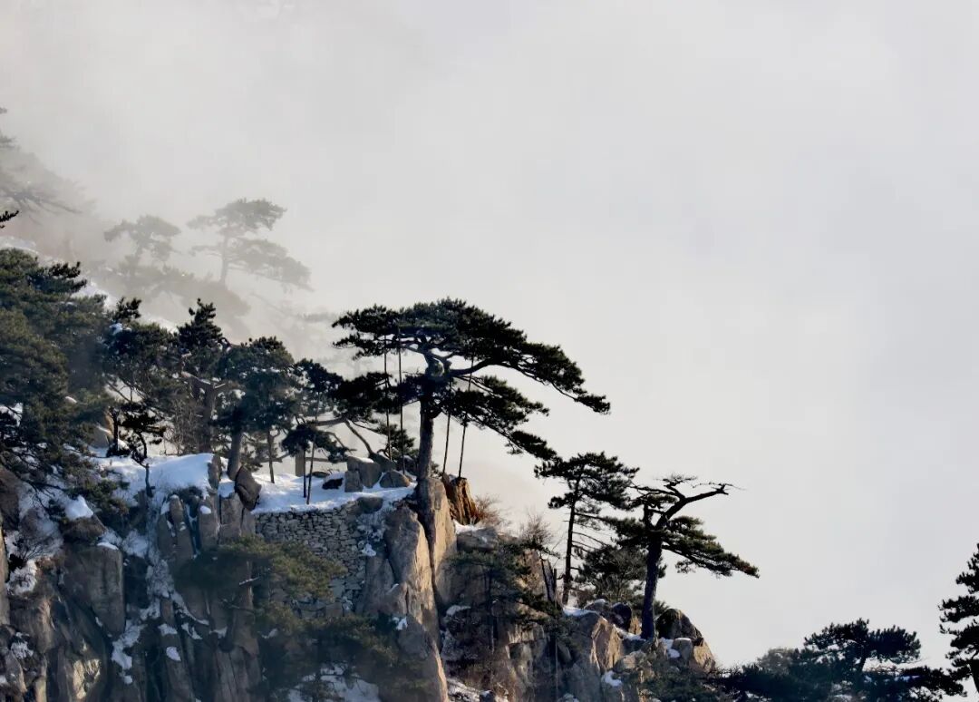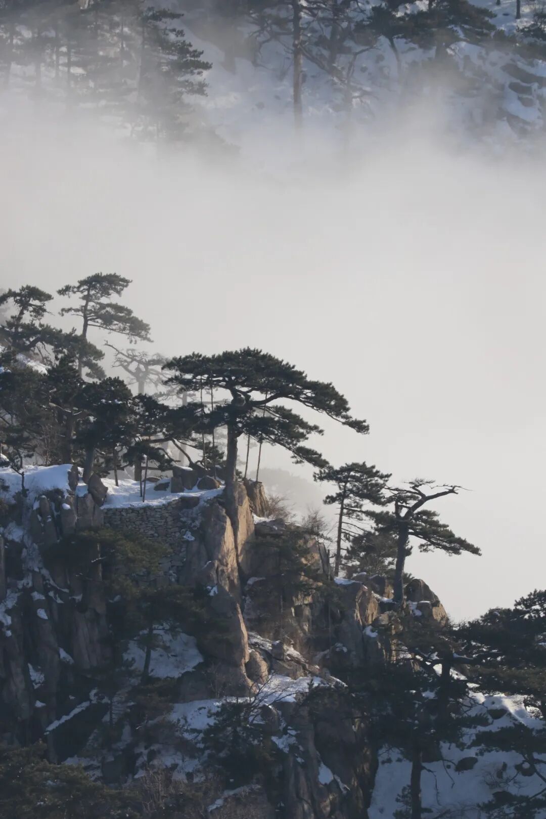 云海自山谷间翻涌升腾,如万顷碧波漫过峰峦。古松从云雾中探出身姿,墨绿的树冠在白茫茫的云涛中格外醒目,宛如仙境中的迎客使者。远处的山峦在雾霭中层层晕染,近处的石砌矮墙与覆雪的岩峰相映成趣,将千年的时光都凝在了这冰雪与云雾之间。