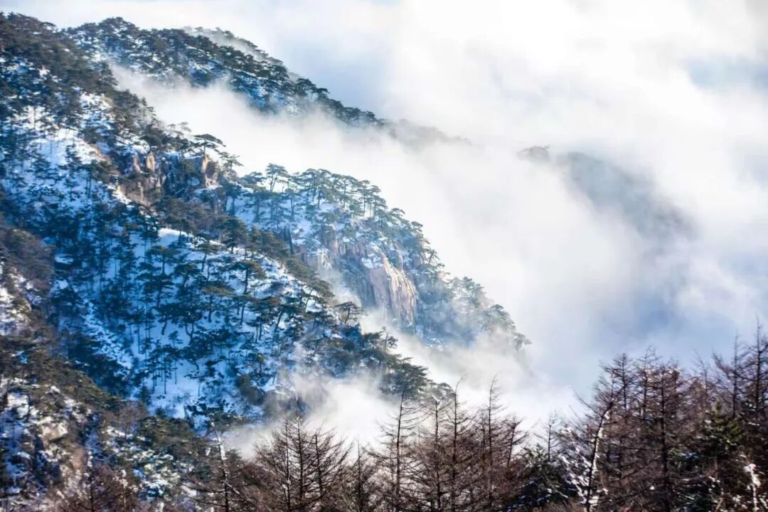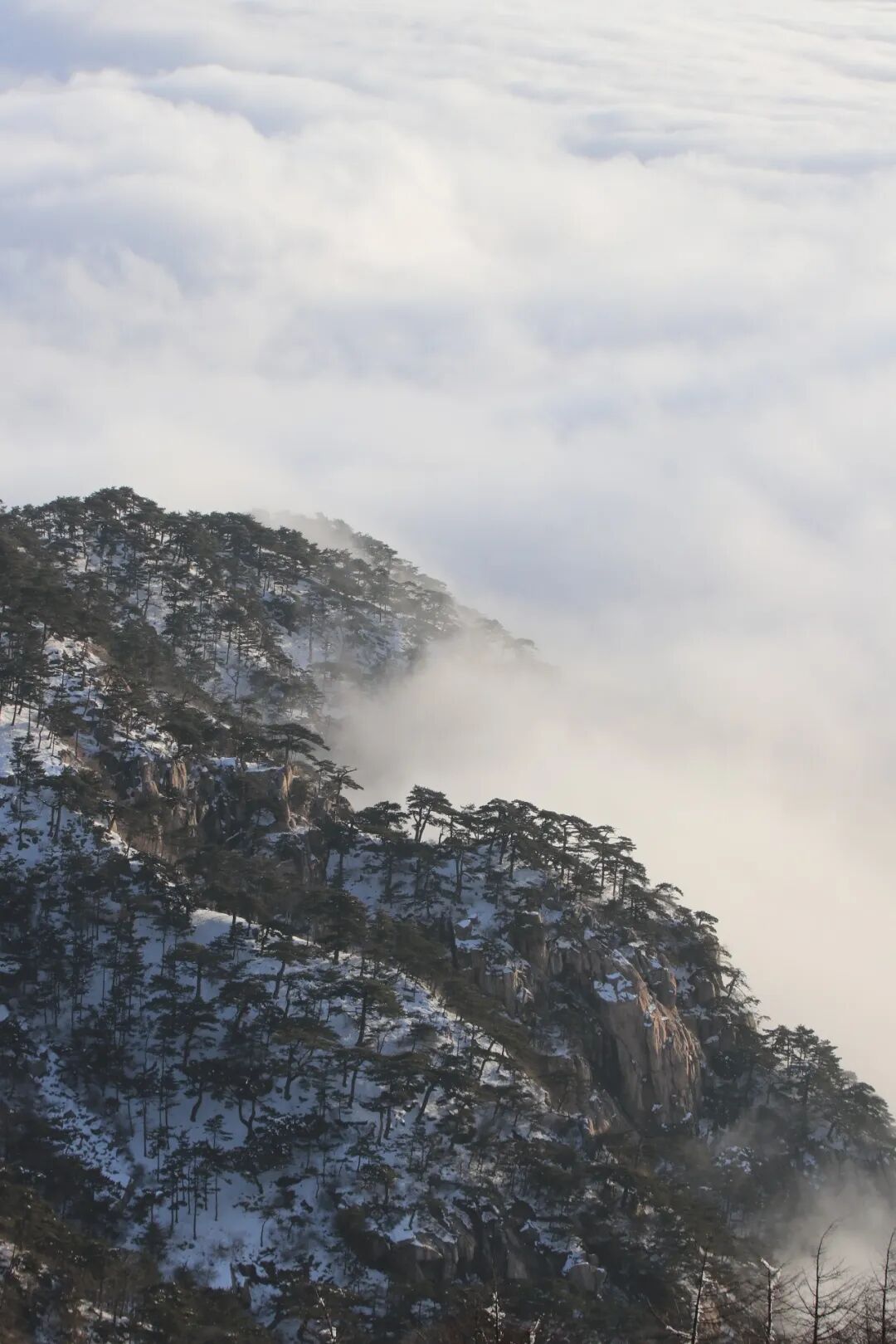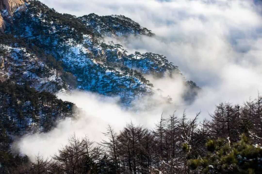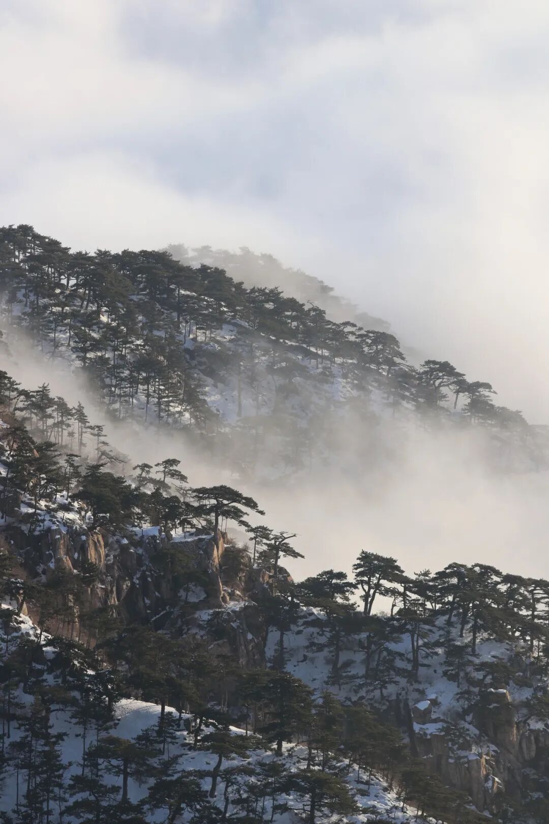 云海自山谷间翻涌升腾,如万顷碧波漫过峰峦。古松从云雾中探出身姿,墨绿的树冠在白茫茫的云涛中格外醒目,宛如仙境中的迎客使者。远处的山峦在雾霭中层层晕染,近处的石砌矮墙与覆雪的岩峰相映成趣,将千年的时光都凝在了这冰雪与云雾之间。