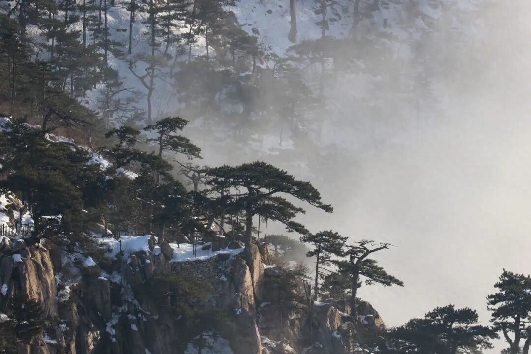 在泰山的悬崖之上,一株株古松扎根岩隙,虬枝盘绕,在云海与雾凇间,守望着这座“五岳独尊”的千年岁月。