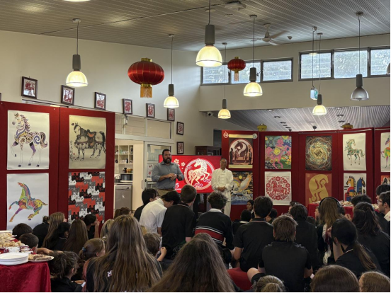 活动现场年味浓郁、氛围喜庆,百余名中澳师生齐聚一堂,共庆马年新春。蒙特克里尔中学副校长马修致辞,向师生送上新春祝福,并对山东工艺美术学院赠送的马年艺术作品表示感谢。他指出,这些作品兼具设计巧思与文化内涵,让学生近距离感受中华生肖文化,也为校园多元文化建设注入了更多中国元素。