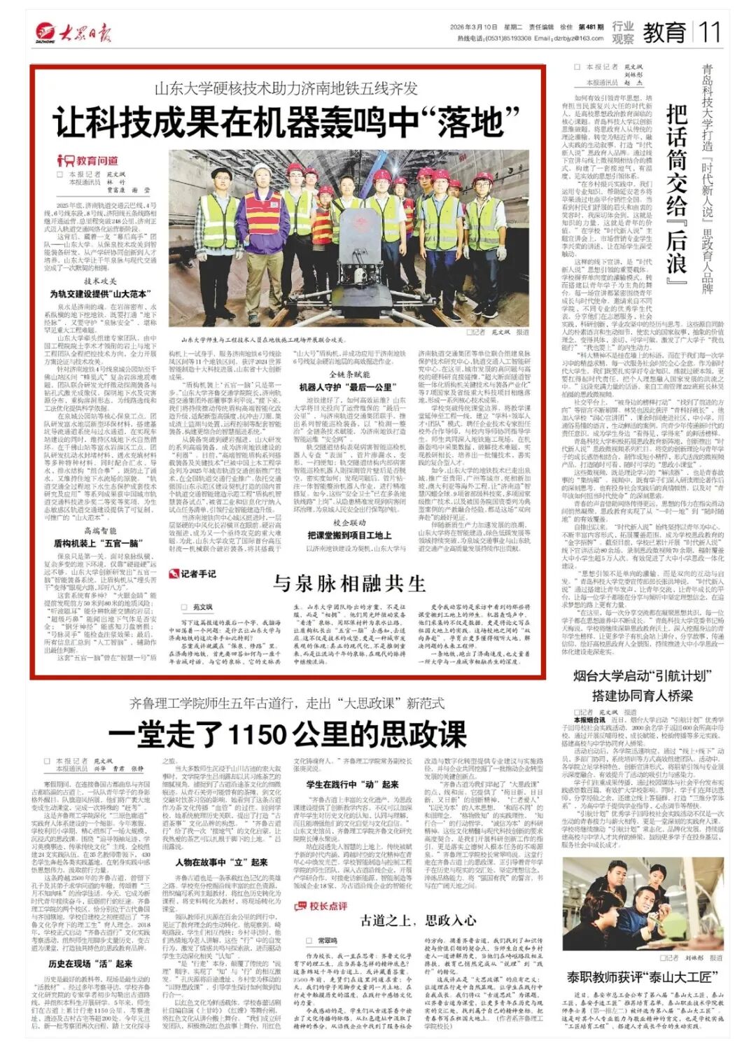 从装备突破到硬岩掘进,山大研发的系列高端装备,成为济南地铁建设的“利器”。目前,“高端智能盾构系列搭载装备及关键技术”已被中国土木工程学会列为2025年城市轨道交通创新推广技术,在全国轨道交通行业推广。依托交通强国山东示范区建设契机打造的国内首个轨道交通智能建造示范工程“盾构机智慧装备试点”,被省工业和信息化厅纳入试点任务清单,引领行业智能建造升级。