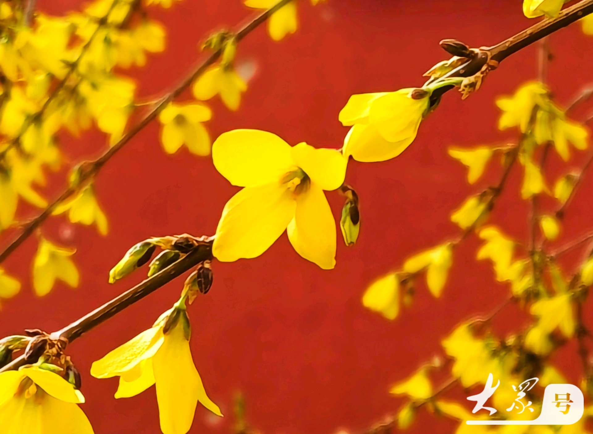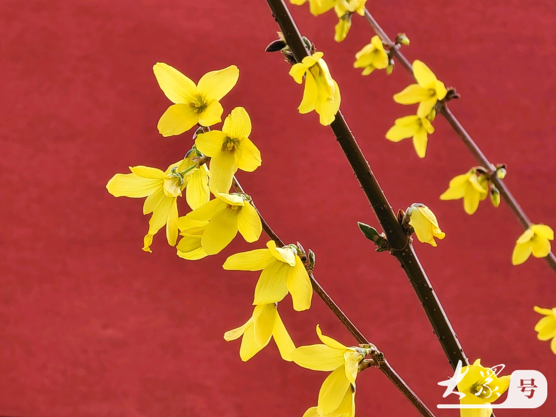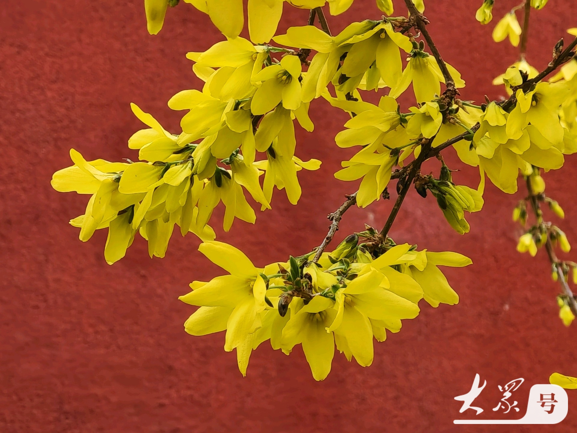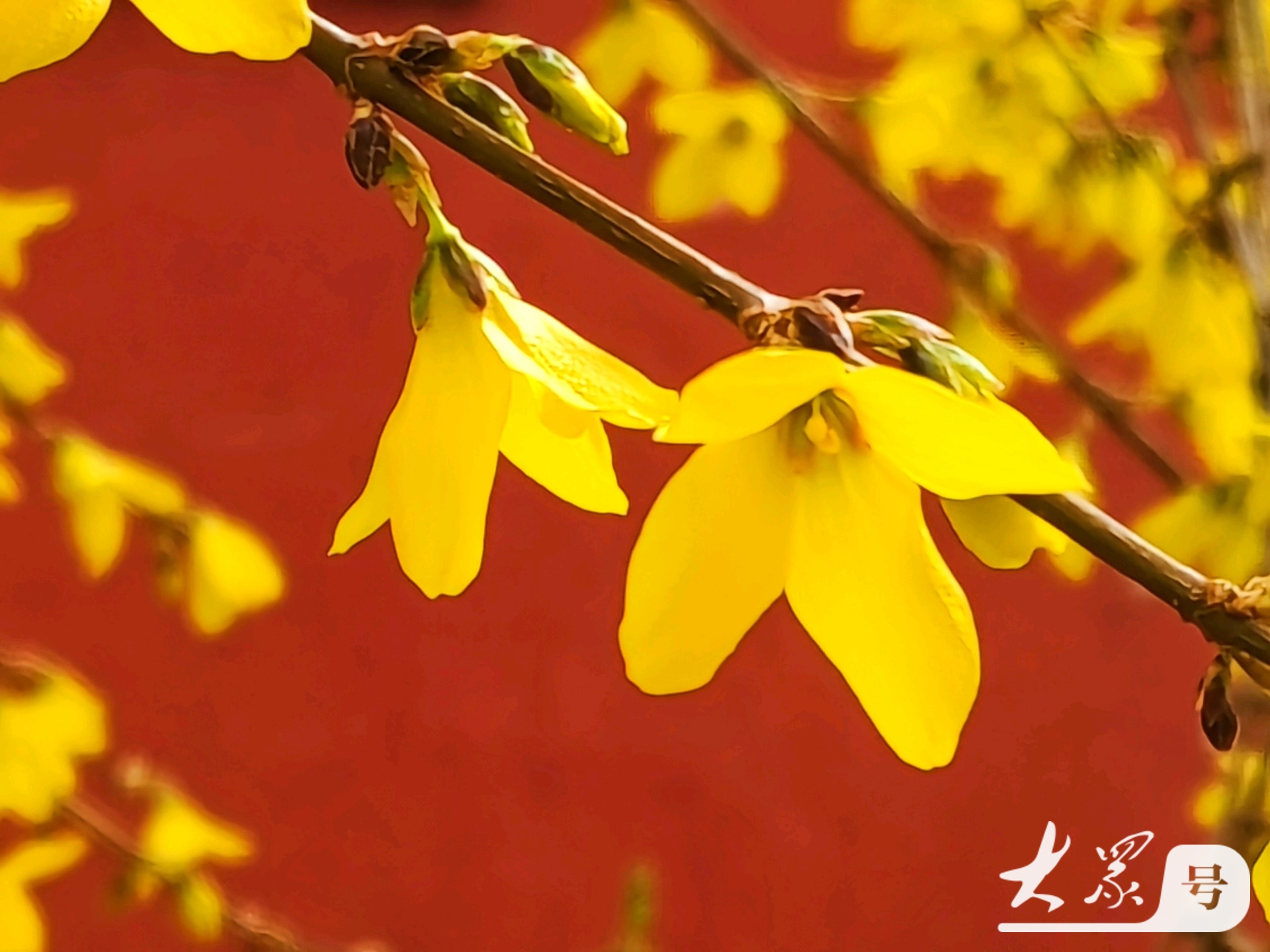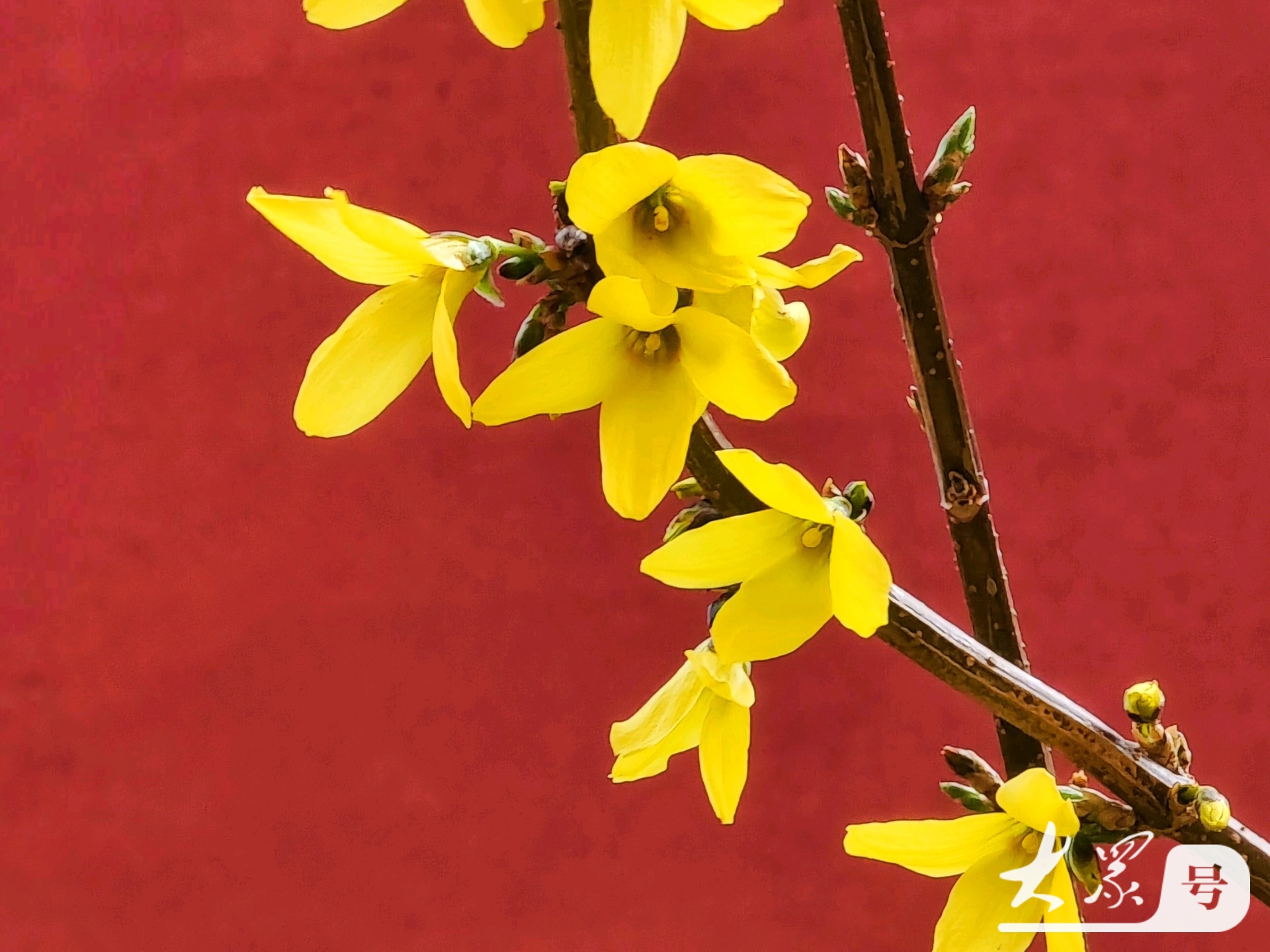金黄连翘花翘首与古典红墙共赴春日之约
