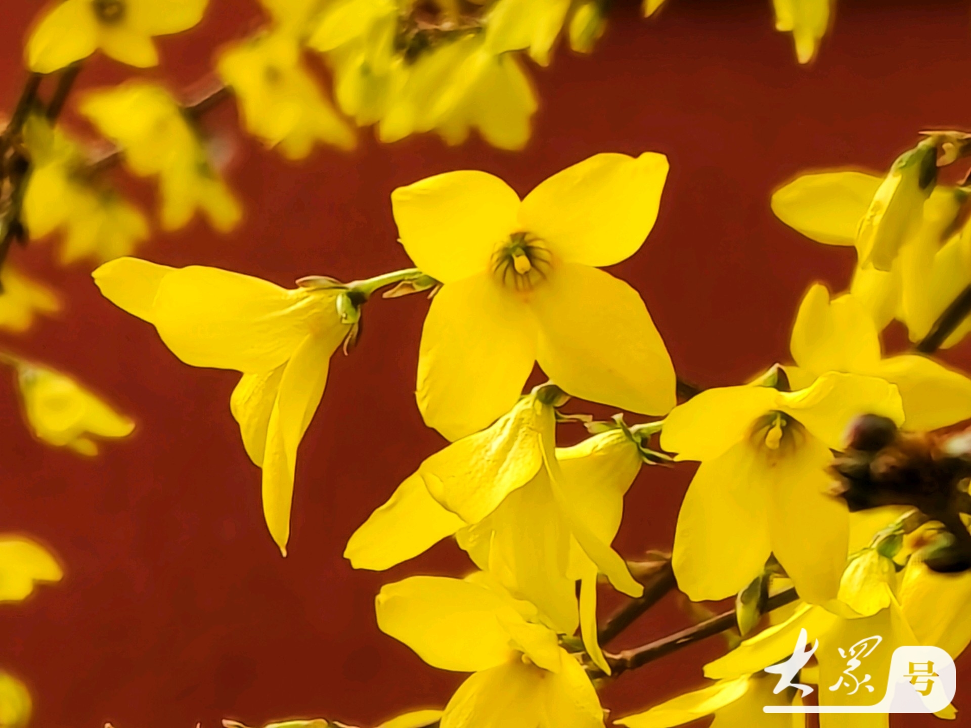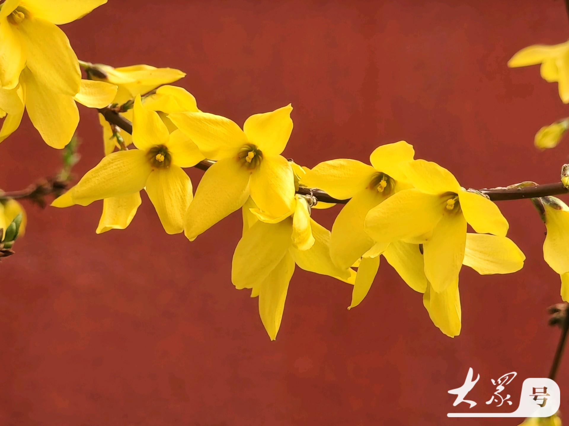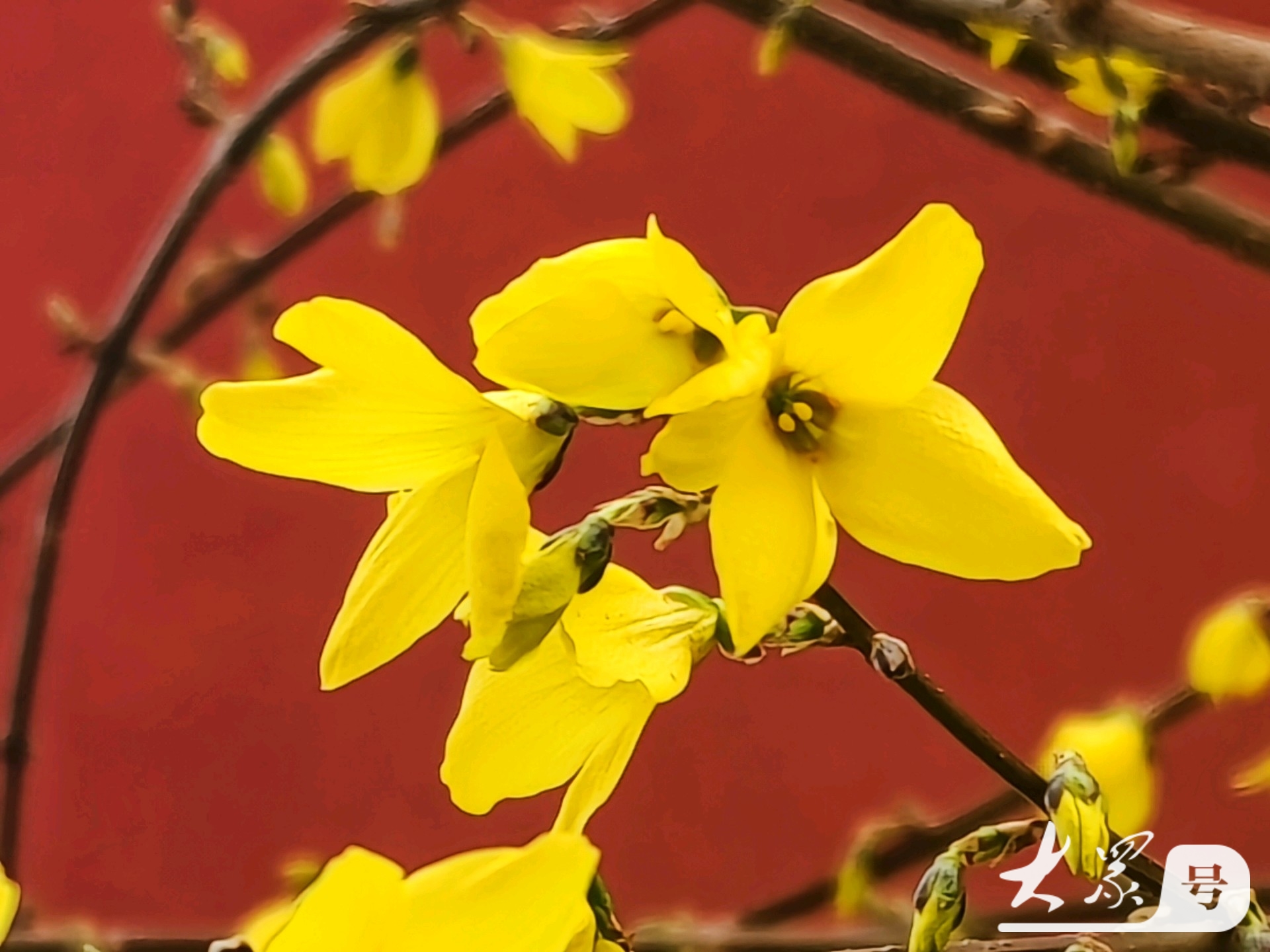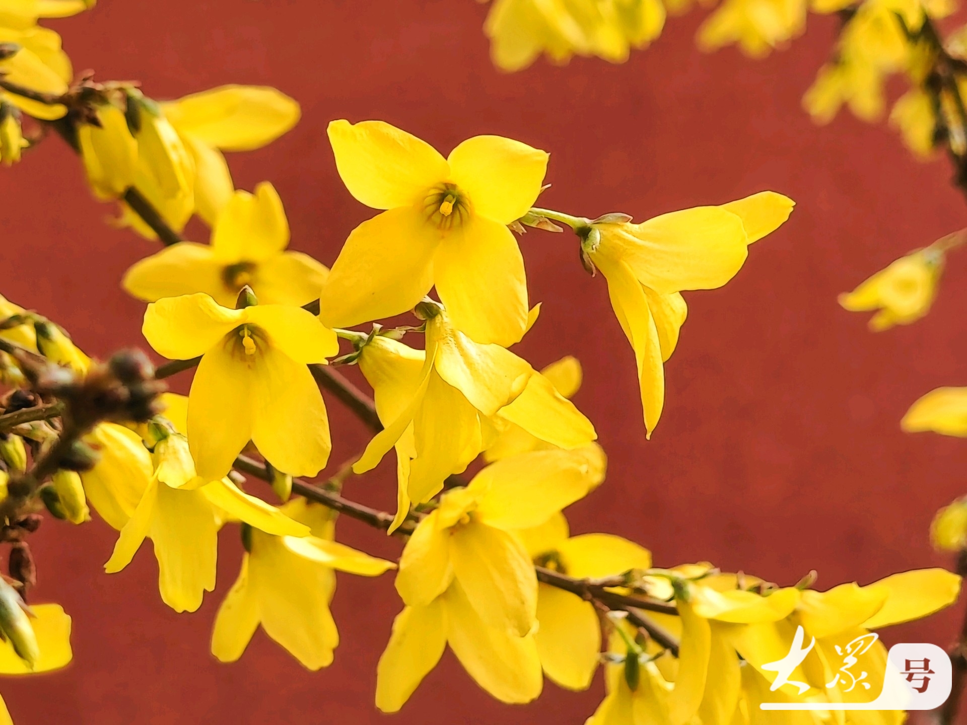 金黄连翘花翘首与古典红墙共赴春日之约