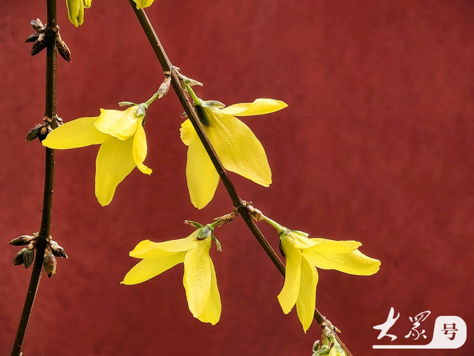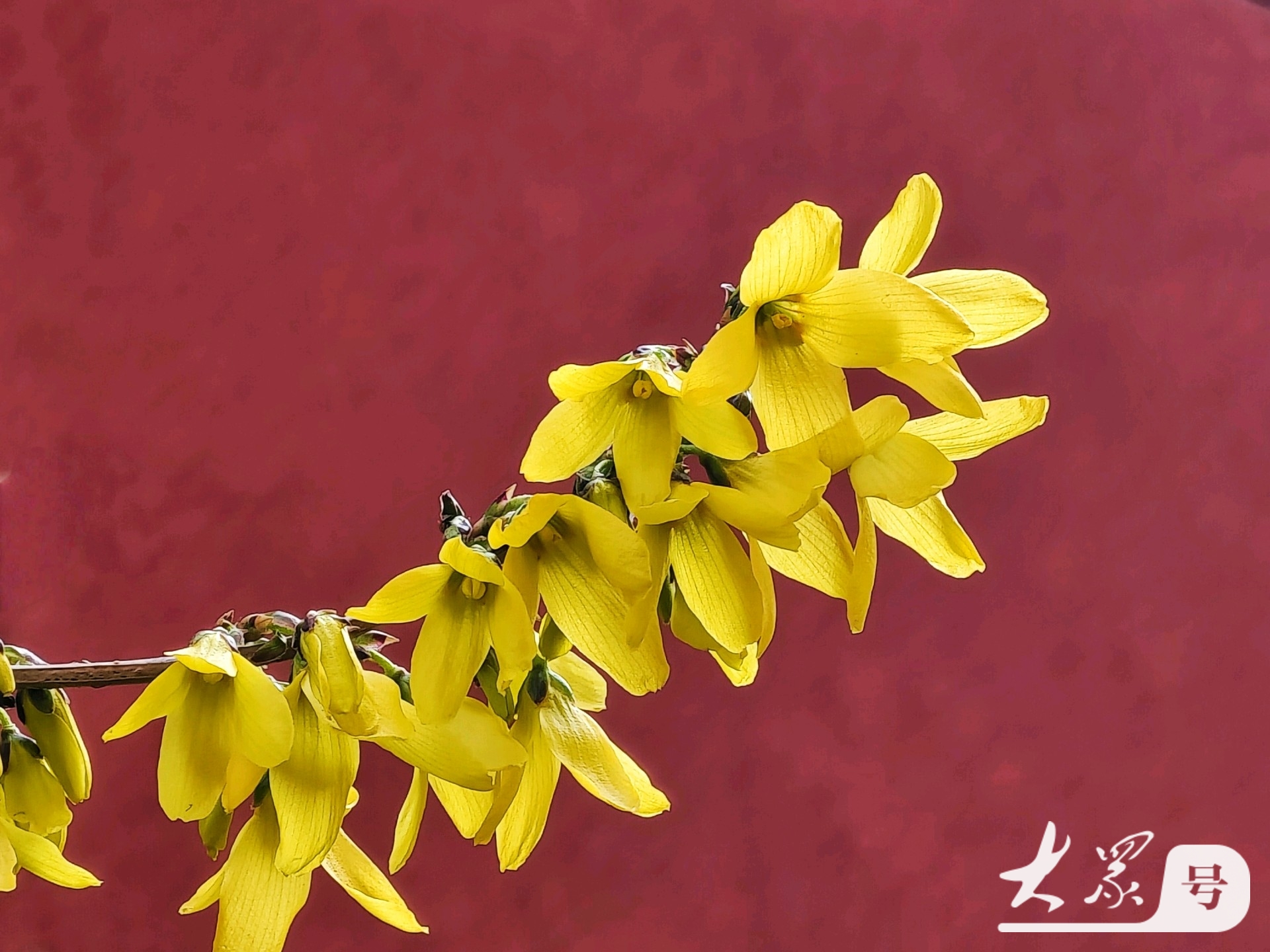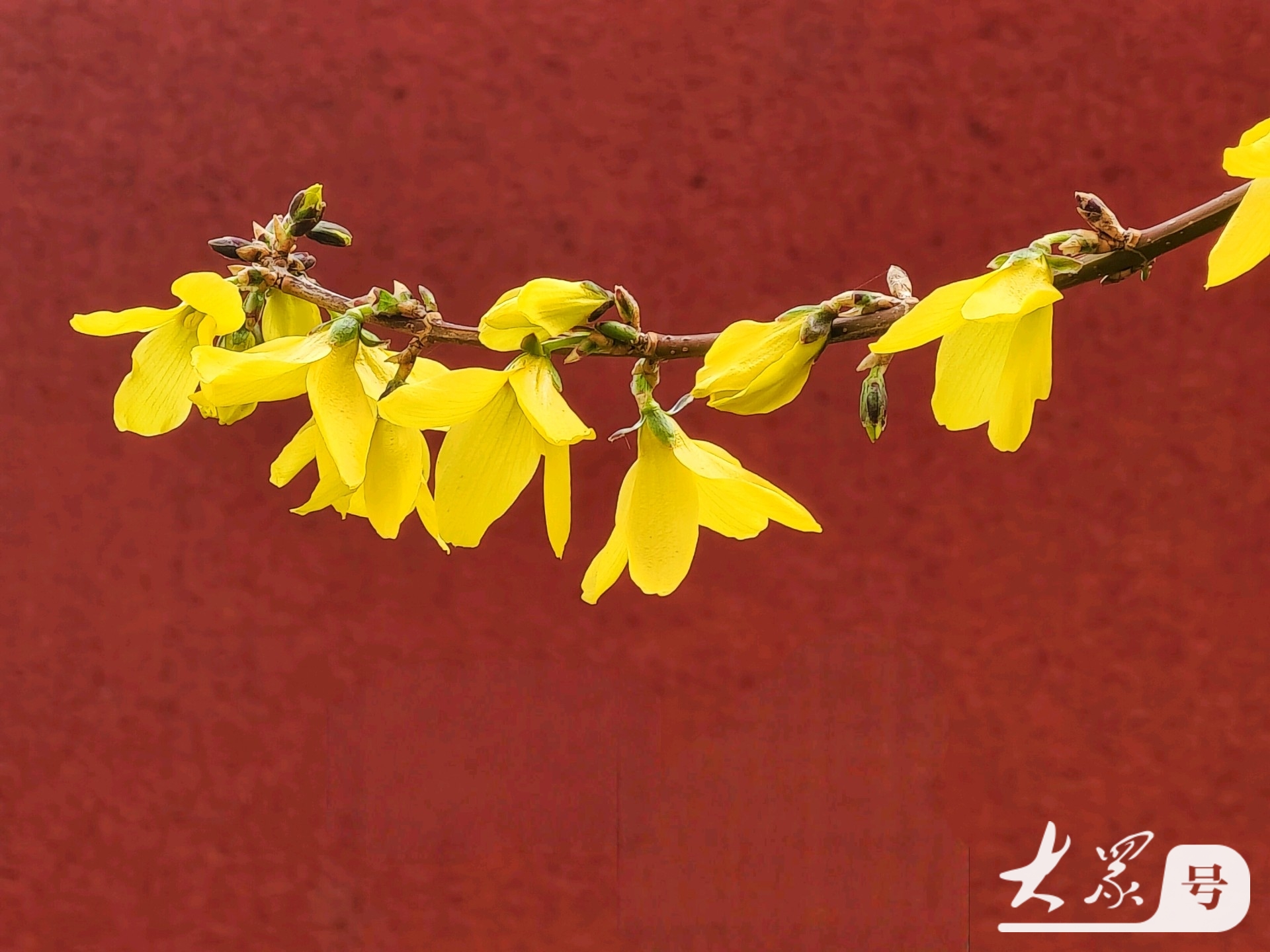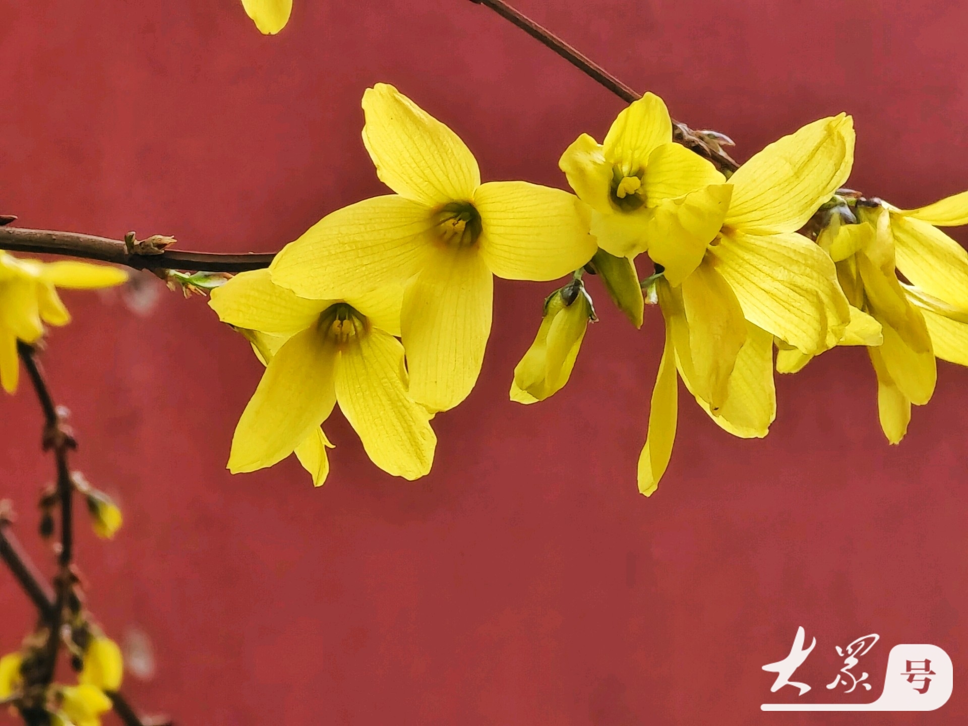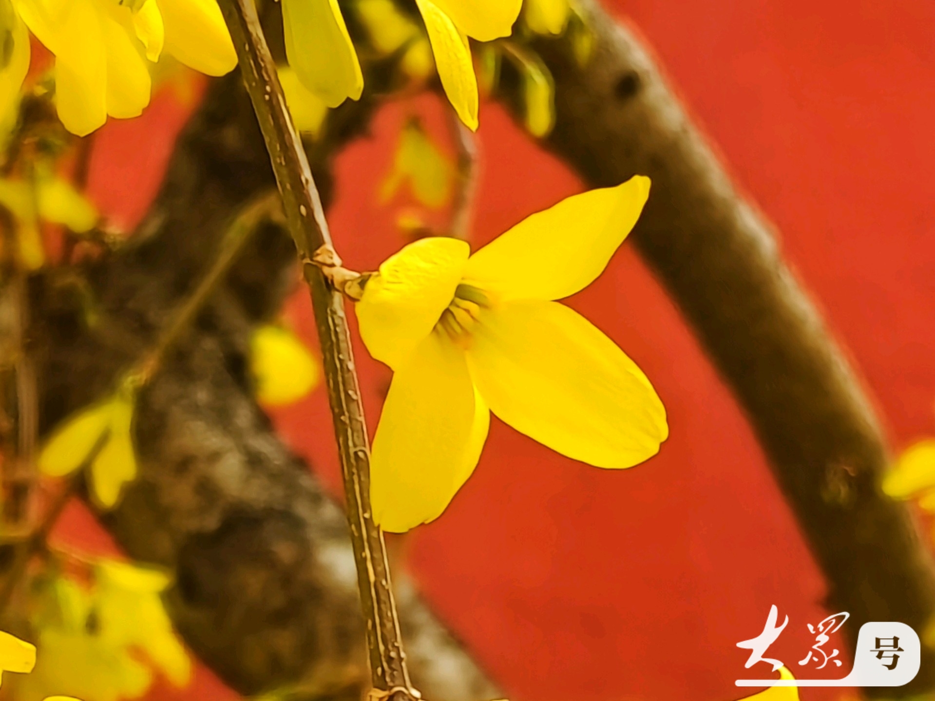 金黄连翘花翘首与古典红墙共赴春日之约