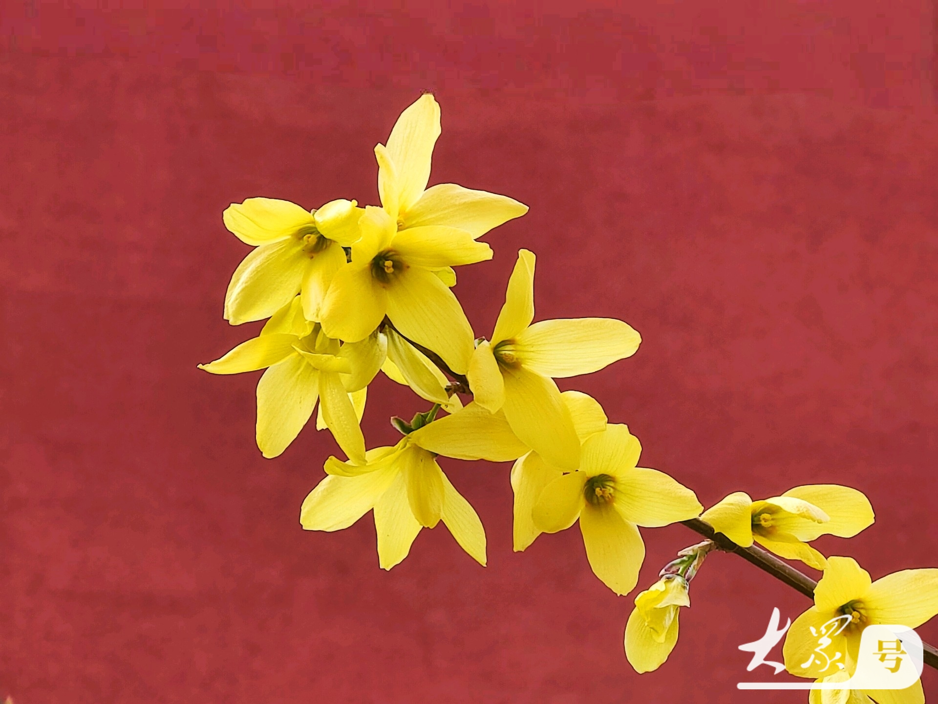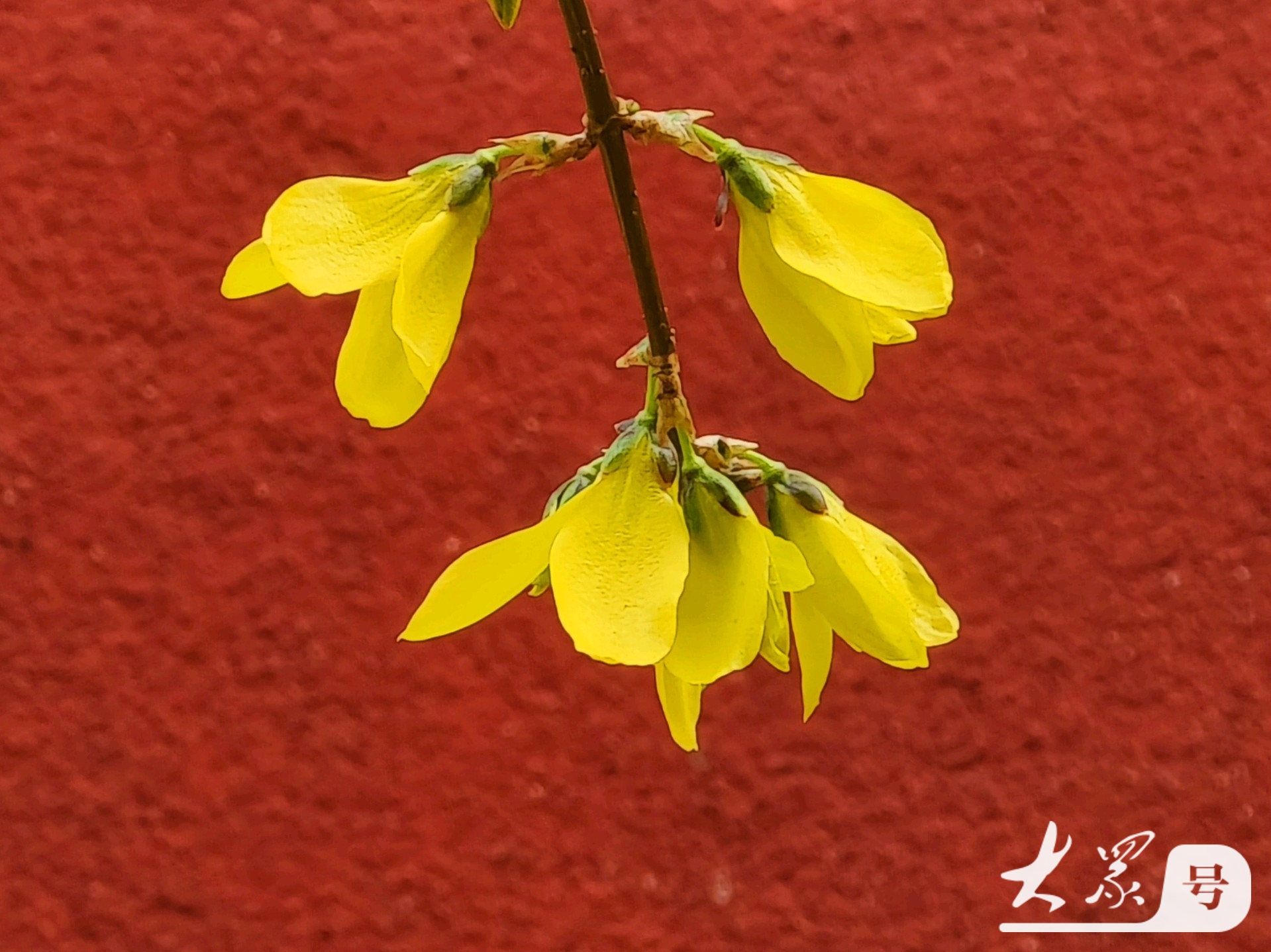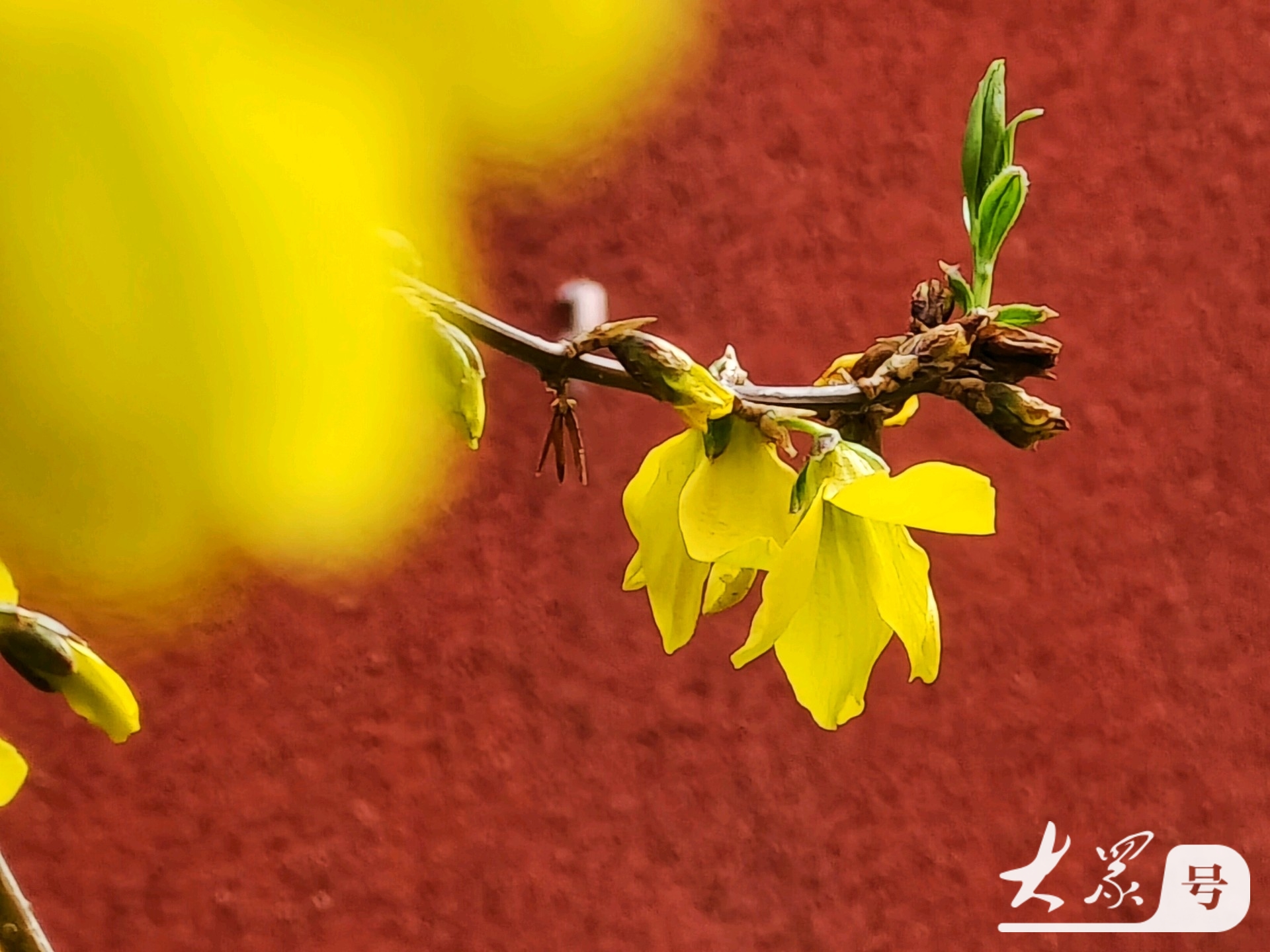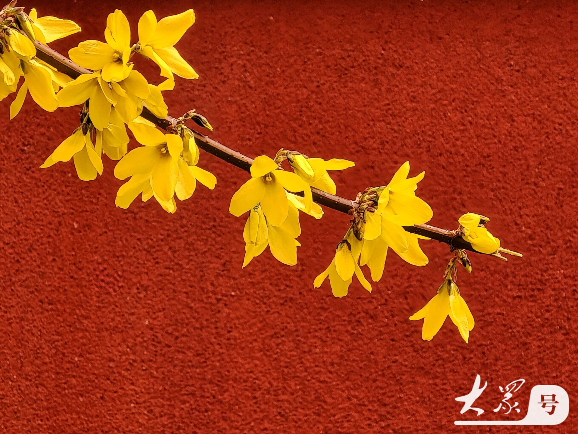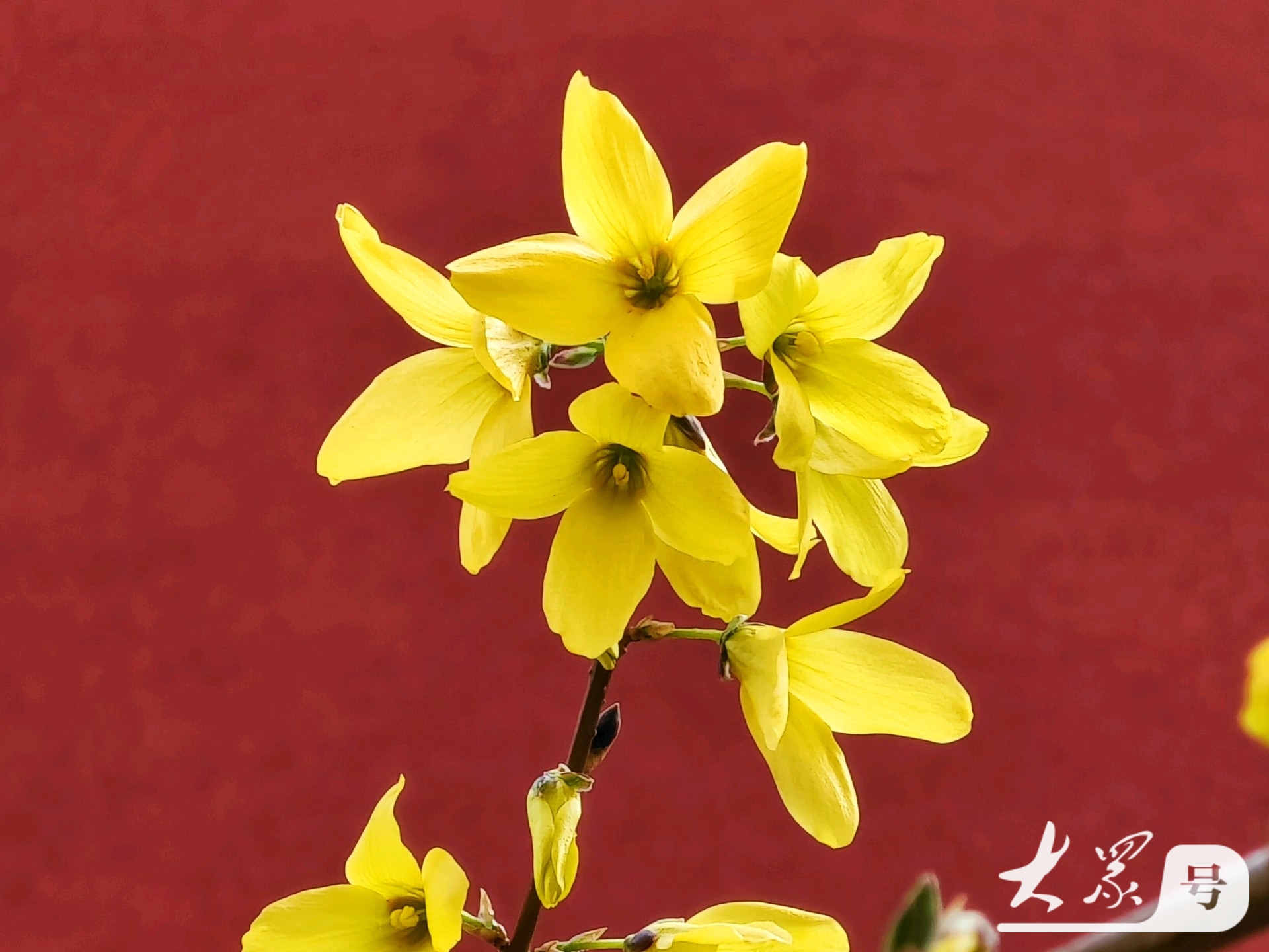 金黄连翘花翘首与古典红墙共赴春日之约