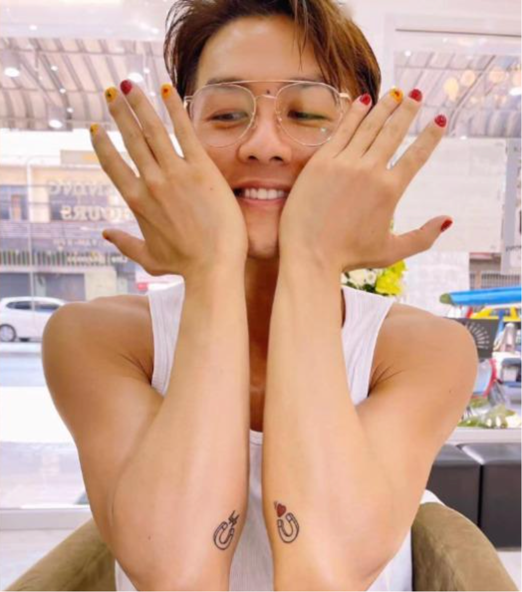 2023年,他在两个手臂上纹了两个U型磁铁,一个有爱心,一个有闪电。