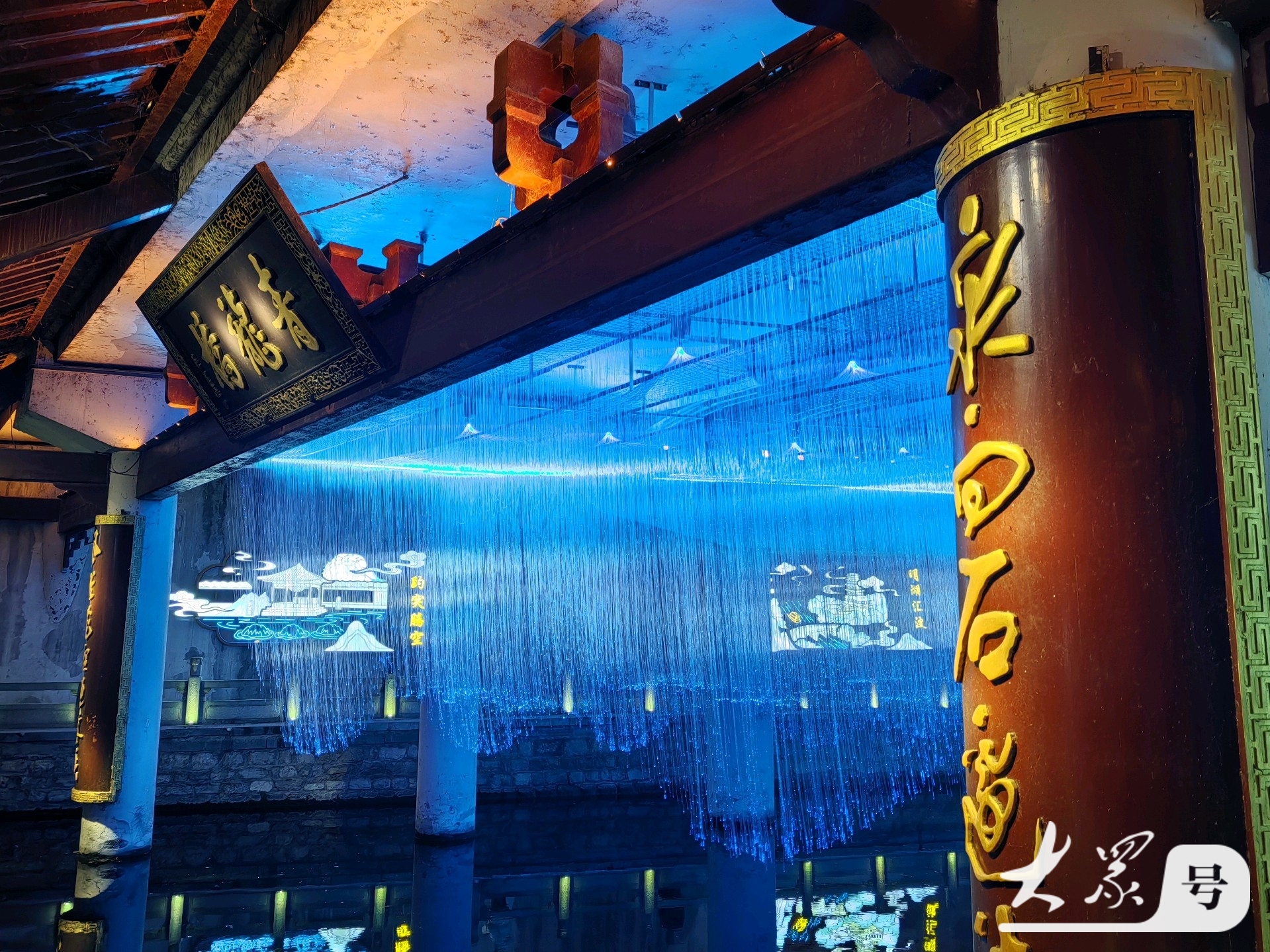 夜幕降临,桥下垂落如蓝色瀑布般的光帘,桥顶繁星点点,在河面漾起粼粼波光,营造出“桥载星河,梦渡古意”的沉浸式浪漫氛围。