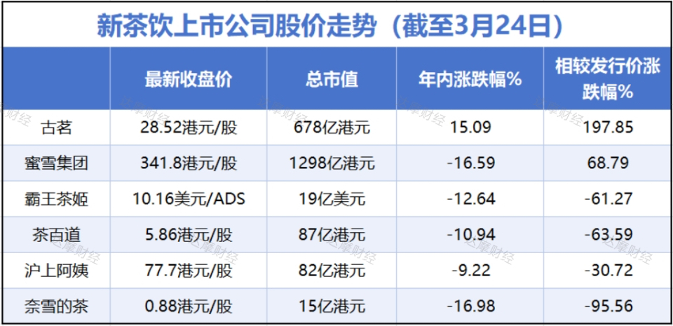 同在去年上市的古茗成为新茶饮行业的“股价黑马”,截至3月24日,公司股价收于28.52港元/股,总市值为678亿港元。古茗是2026年唯一一家股价上涨的新茶饮品牌,目前其股价较发行价上涨了近2倍。