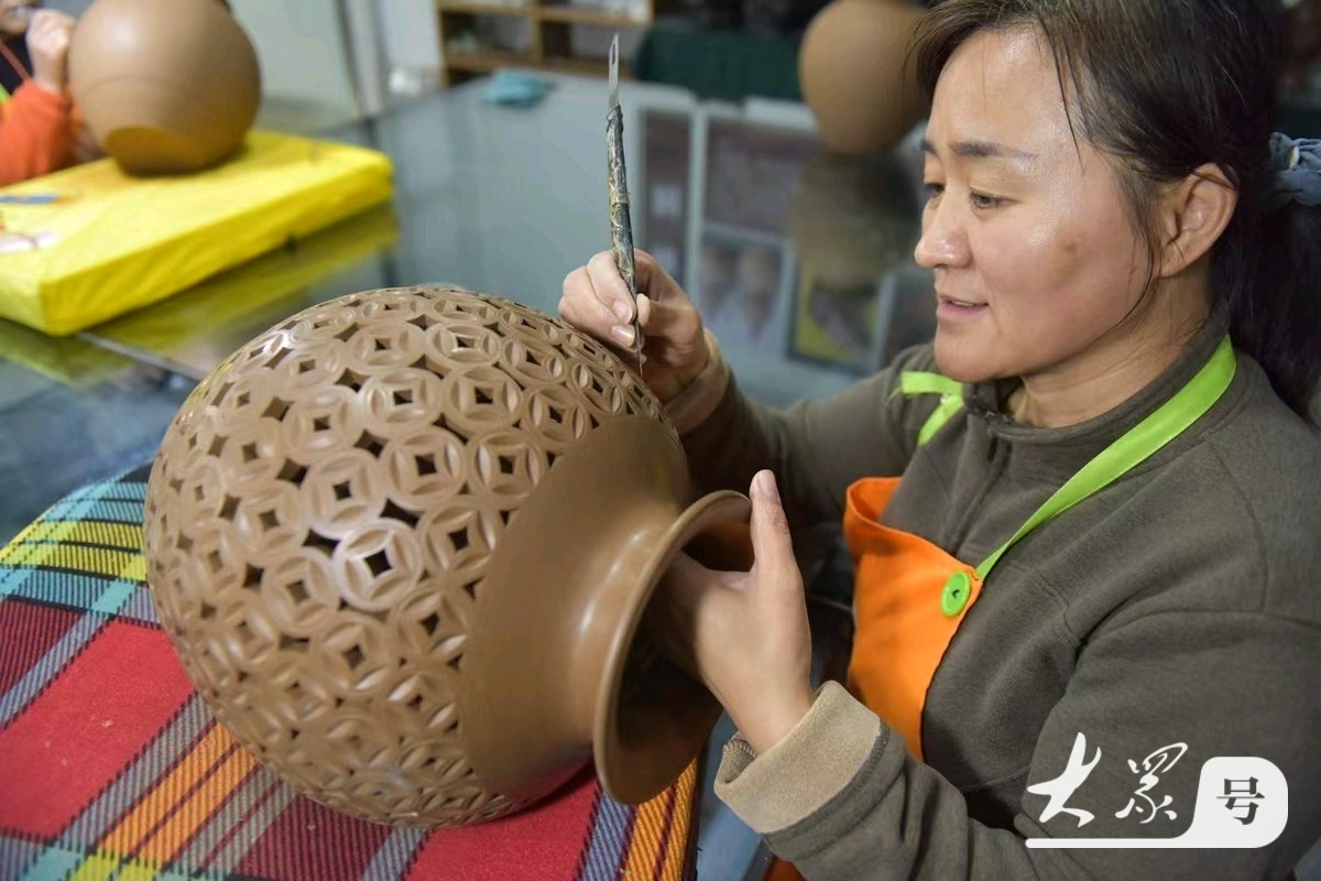 在济南济阳的黑陶工坊里,非遗传承人徐庆增正专注地雕琢着手中的陶土。