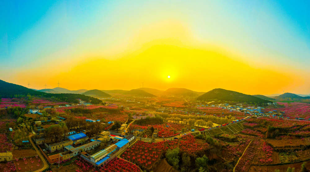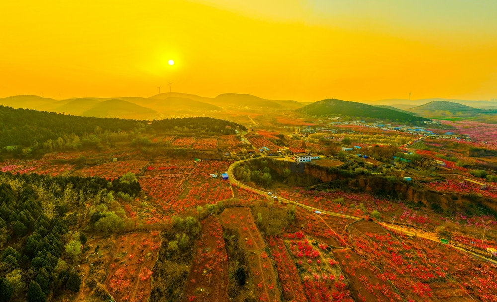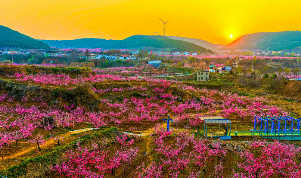霞光之下,桃花将大地染成一片温柔的粉红。十万亩桃花竞相绽放,或深红如醉,或浅粉如羞,层层叠叠的花瓣在嫩绿叶芽的映衬下,宛如漫天云霞落入凡间。仿佛一夜间,东风揭开了天地间最盛大的一场粉白色幕布——自山脚迤逦至地平线尽头,层层叠叠,全是桃花。不是一树两树,而是千万株,织就了一片流动的、温软的烟霞。空气里浮动着清冽的甜香,深吸一口,五脏六腑都好似被这香气涤荡过。