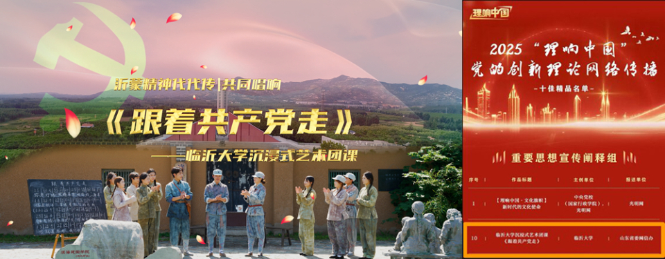 近日,由中央网信办、中央党校(国家行政学院)等多部门联合主办的2025年“理响中国”党的创新理论网络传播活动评选结果正式揭晓。由临沂大学团委制作、传媒学院鲁晴老师指导的沉浸式艺术团课《跟着共产党走》,荣获“重要思想宣传阐释”类别“十佳精品项目”称号。