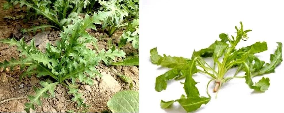 罂粟苗放进嘴里嚼后有淡淡的甜味且发涩,苦菊则发苦。两者茎都很短,但苦菊一簇簇抱团,而罂粟苗的叶子全长在茎上,一层比一层高。
