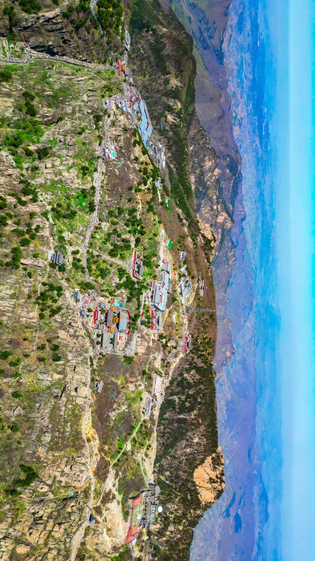 不得不说摄影师特别会抓角度,一条条石阶从高空俯瞰,像一根银色的丝线,把整座山的春色“缝”了起来,好一幅壮美图景!
