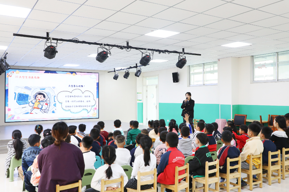 在“中国航天真厉害”环节,任倩雯讲述了世界航天第一人“万户”的故事,以及中国航天英雄杨利伟、翟志刚、刘洋、王亚平等英雄事迹。孩子们听得入神,不时发出惊叹声。当看到王亚平在太空中“飘着”上课的画面时,小朋友们激动地瞪大了眼睛、长大了嘴巴。