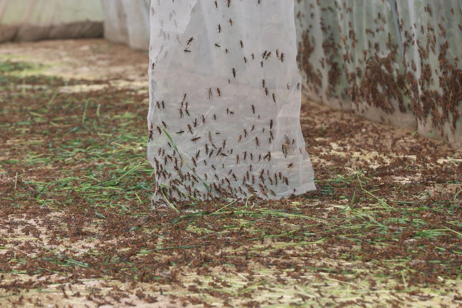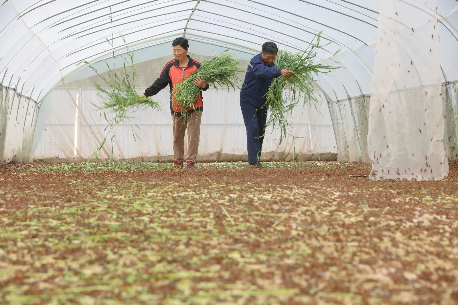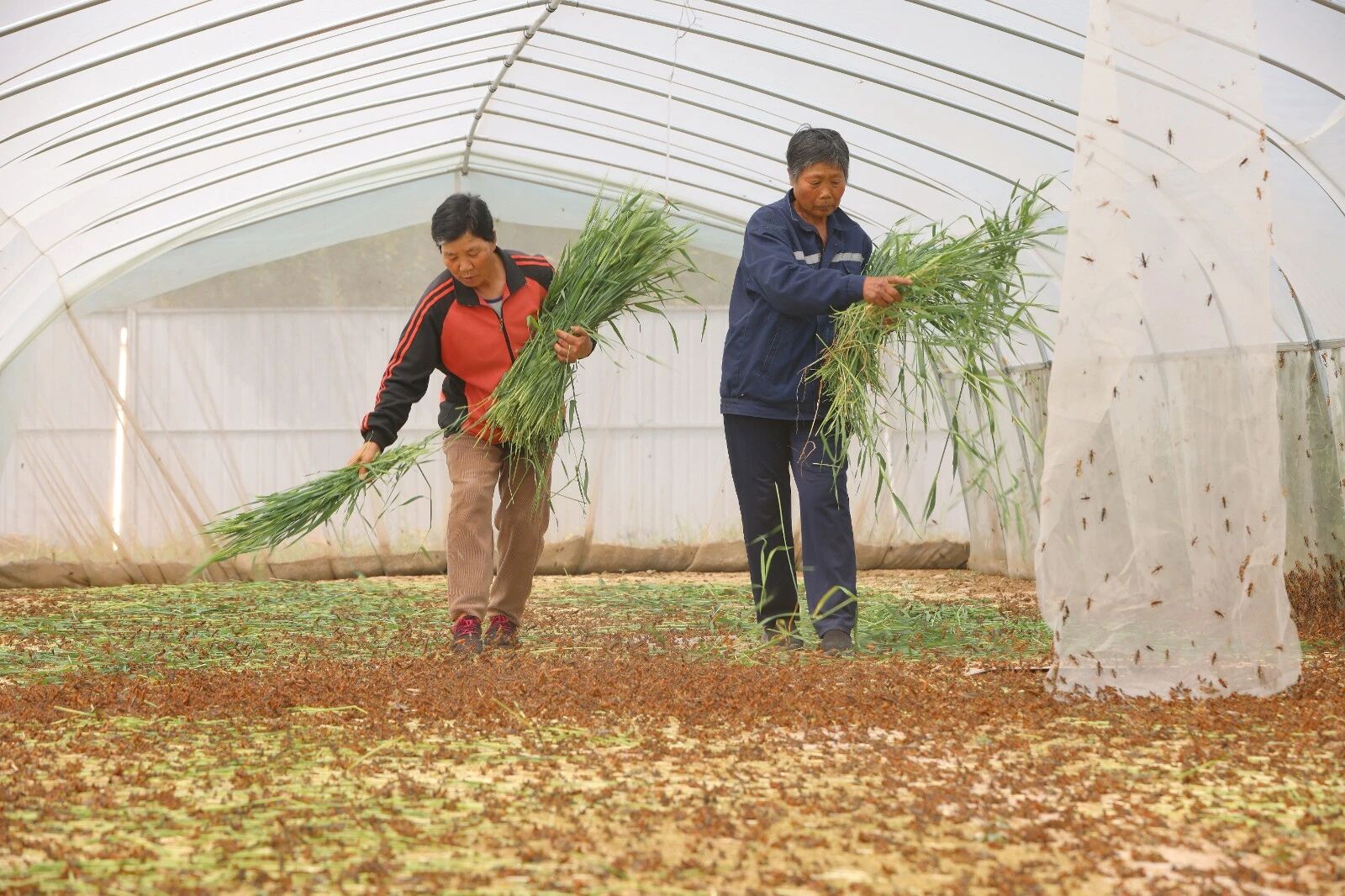 4月27日,邹平市韩店肖镇绿昆蚂蚱养殖专业合作社大棚内,养殖人员在忙着喂养蚂蚱。