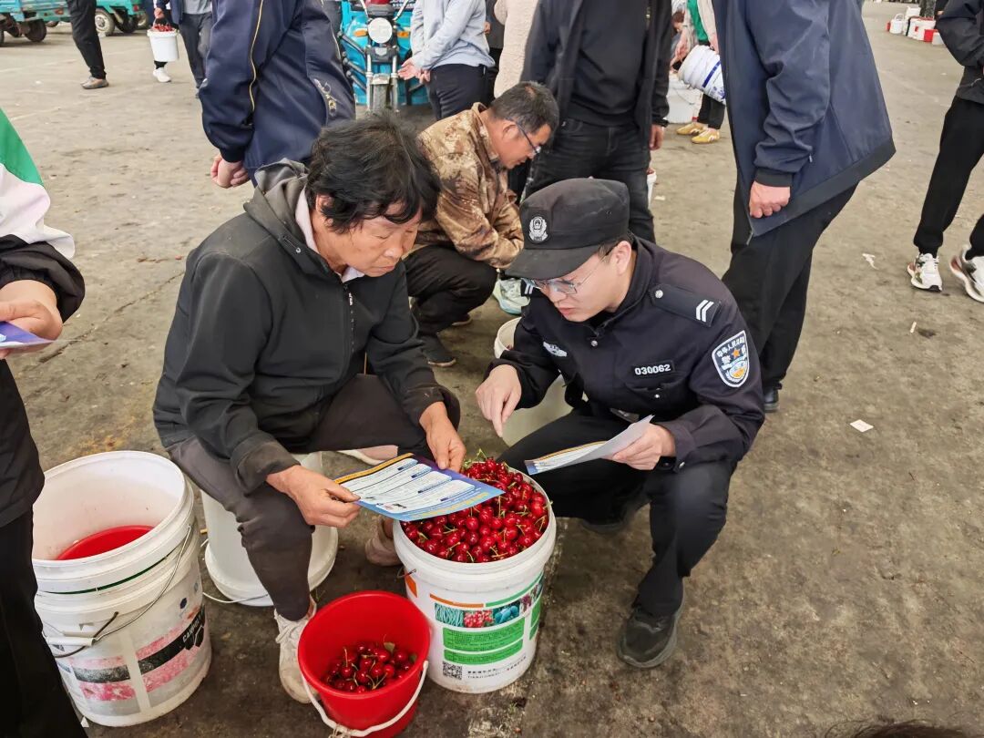 山旺大樱桃上市以来,山旺派出所锚定“强打击、严防范、降警情、控发案”目标,紧盯樱桃市场治安重点,优化巡防部署、强化打击效能、做实源头防范,以“时时放心不下”的责任感,护航果农增收、客商安心,让“春果第一枝”更红艳、市场秩序更稳定、群众安全感更充盈。