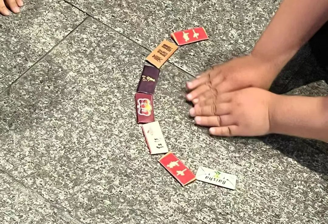 “烟卡”由废弃烟盒制作而成小孩们把各种烟盒盖撕下来折成长方形卡片双手合拢