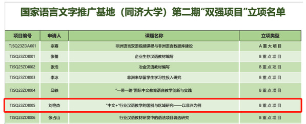 近日,国家语言文字推广基地(同济大学)公布了第二期“双强项目”立项名单,山东外事职业大学国际交流学院中文国际教育专业申报的课题《“中文+”行业汉语的国别与区域研究—以非洲为例》成功获得重点项目立项。这是该专业连续第二年斩获“双强项目”课题立项。