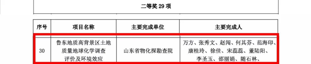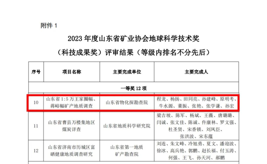 日前,山东省矿业协会公布了2023年度省矿业地球科学技术奖表彰结果,山东省物化探勘查院选报的“山东省1:5万王家圈幅、蒋峪幅矿产地质调查”和“鲁东地质高背景区土地质量地球化学调查评价及环境效应”分获一等奖、二等奖。