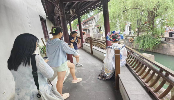 7月17日,宋嘉茵和郭美玲继续从事街头摄影工作,最近几天的苏州,室外温度高达32度,面对酷暑她们没有退缩,在烈日下扛着沉重的相机努力招揽游客,最终收入195元。