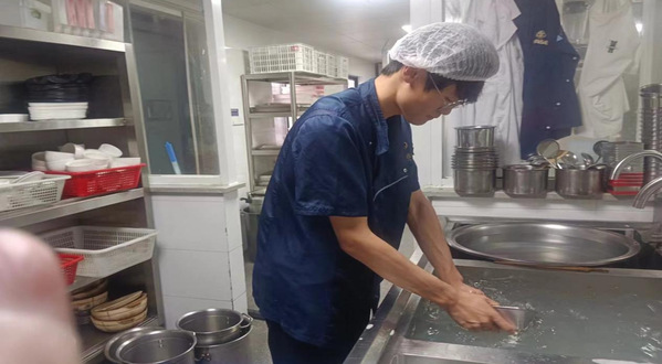 延成旭等同学结束白天的酒店工作后,又找到夜间刷碗工作,早六晚九,一整天都在为工作奔波,晚上10:30才回到住处。他的手因长时间刷碗而发白、起皱,他切身感受到洗碗工的不易与艰辛,赚得120元。李磊同学传菜端盘工作长达14小时之久,最终收获274元,下班时已抬不起双臂,甚是艰辛。