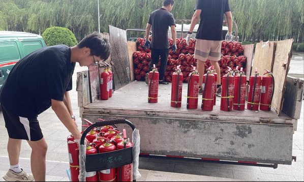 第一组两名同学在消防公司的工厂辛勤地擦灭火器、撕标签及卸车。第二组两名同学,他们奔赴指定地点,负责将灭火器从楼上搬到楼下,劳动强度颇大。第三组的任务是把第一批换完干粉的灭火器放回教学楼。