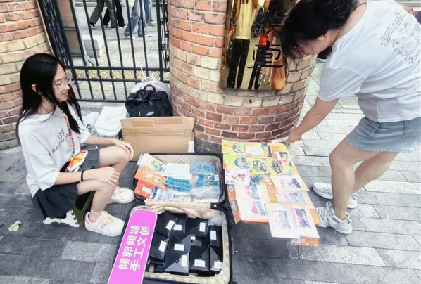 17日上午,女生分为两组进行兼职。一组女生提前用经费批发了天津文创工艺品和饰品前往西开教堂附近摆摊售卖。她们不断向过往的游客介绍商品,虽然中途有被城管驱赶,但她们用热情和实惠换来了游客的光顾,收获100余元。