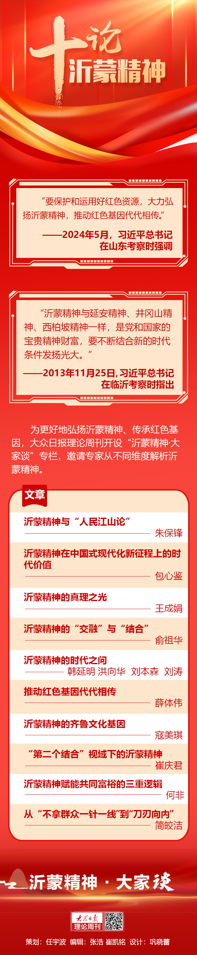 2024年5月,习近平总书记在山东考察时强调,“要保护和运用好红色资源,大力弘扬沂蒙精神,推动红色基因代代相传。”在此之前的2013年11月25日,习近平总书记在临沂考察时也深刻指出:“沂蒙精神与延安精神、井冈山精神、西柏坡精神一样,是党和国家的宝贵精神财富,要不断结合新的时代条件发扬光大。” 为更好地弘扬沂蒙精神、传承红色基因,大众日报理论周刊开设“沂蒙精神·大家谈”专栏,邀请专家从不同维度解析沂蒙精神。