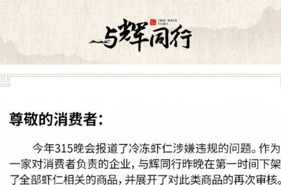 与辉同行:已下架全部虾仁相关商品,将先行对“大岸浪花”虾仁退一赔三