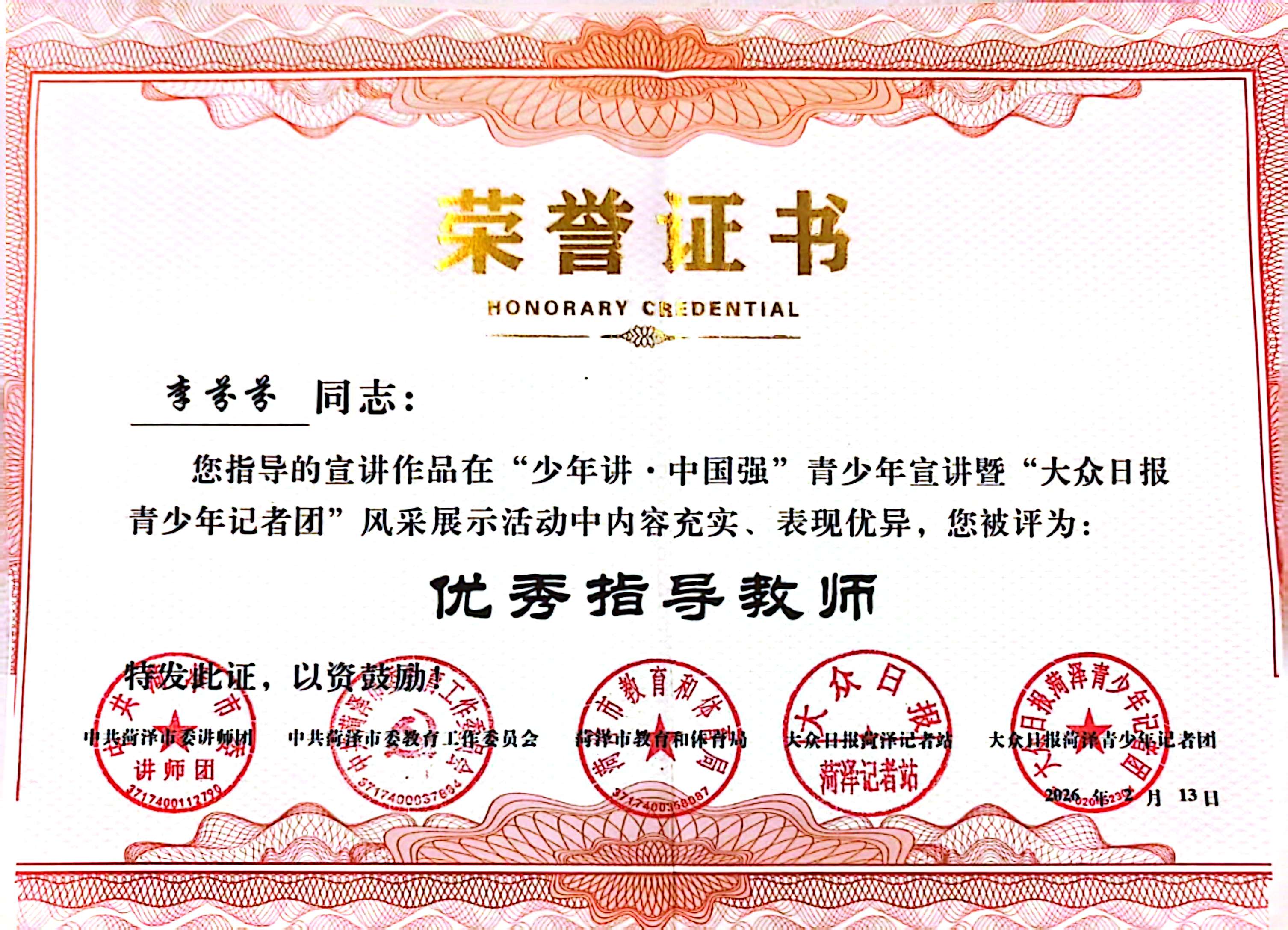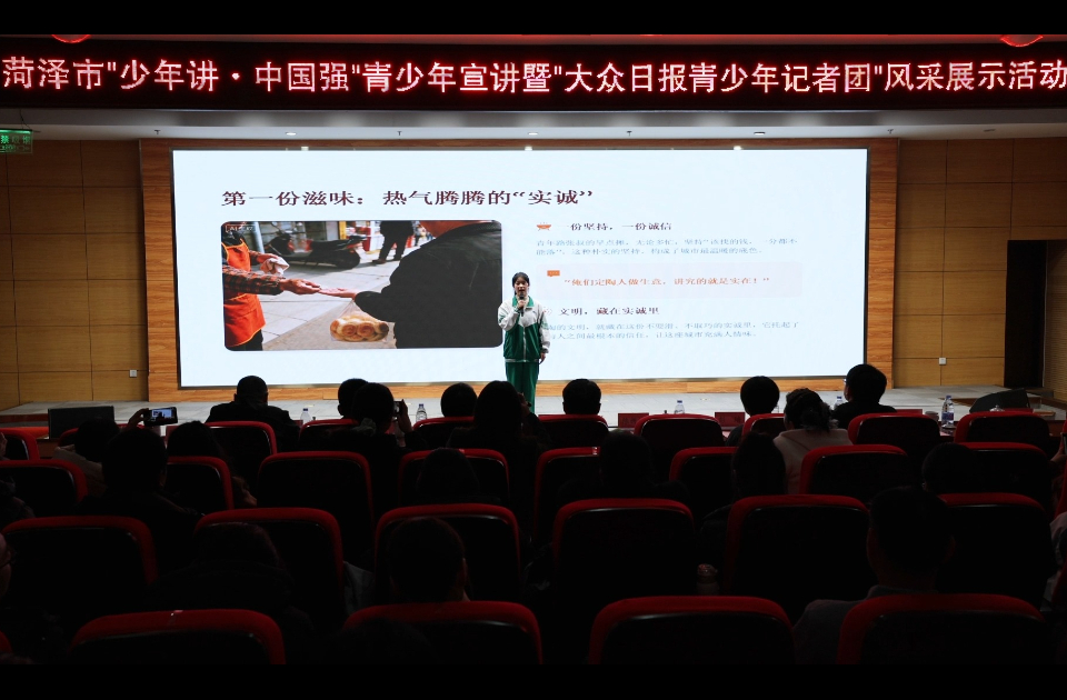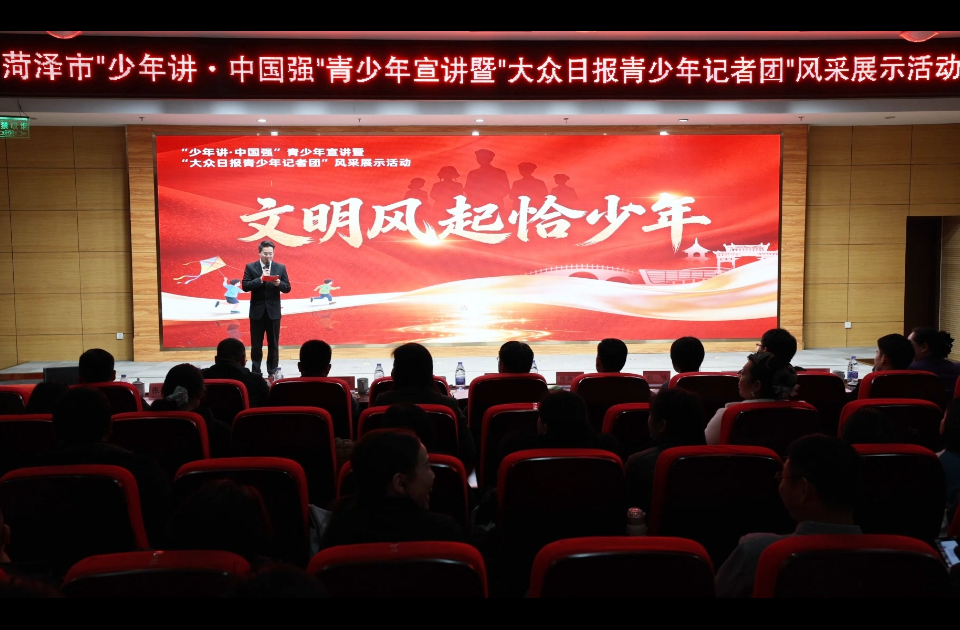 为宣传宣讲党的二十届四中全会精神,推进“强国复兴有我”主题群众性宣传教育活动,加强菏泽市青少年宣传宣讲工作,菏泽市委宣传部、市委讲师团、市委教育工委、市教体局、大众日报菏泽记者站、大众日报菏泽青少年记者团共同举办“少年讲· 中国强”青少年宣讲暨大众日报菏泽青少年记者团风采展示活动。大众日报大众新闻客户端将陆续推送优秀宣讲视频,敬请关注!