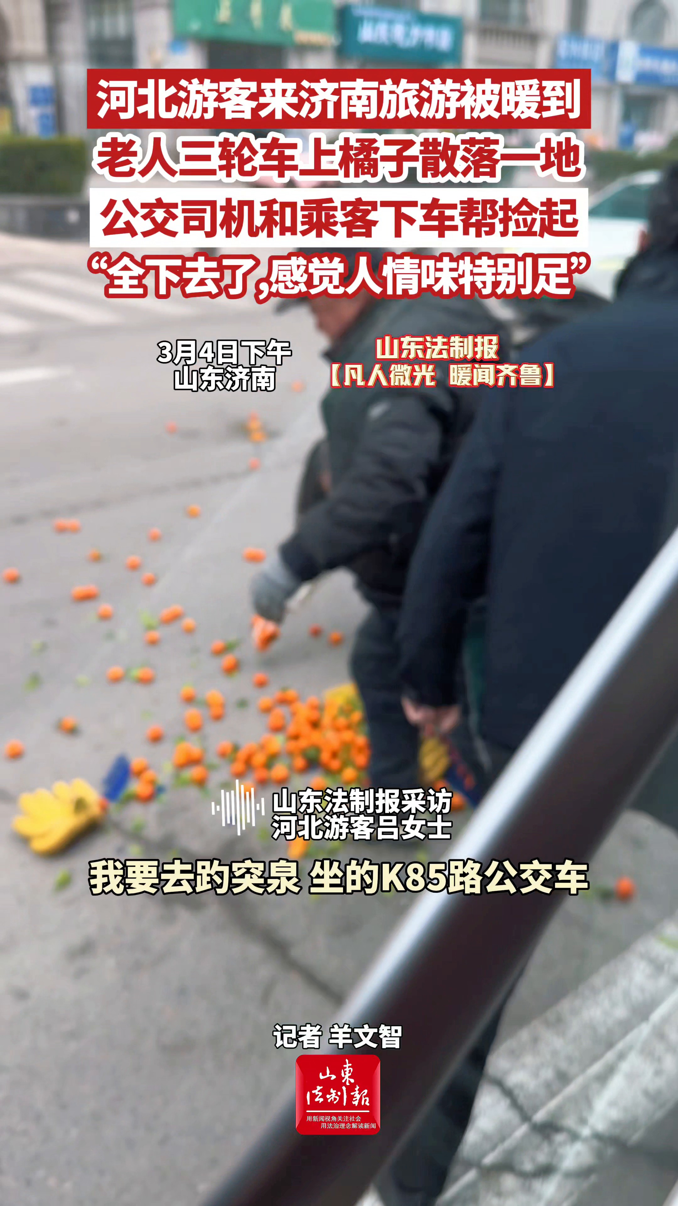 河北游客来济南旅游被暖到,老人三轮车上橘子散落一地,公交司机和乘客下车帮捡起,“全下去了,感觉人情味特别足”