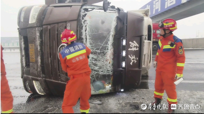 果然视频|雪天路滑,一货车在高速上失控倒翻,消防员及时救援