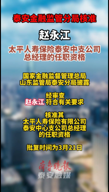 泰安金融监管分局核准赵永江太平人寿保险泰安中支总经理任职资格