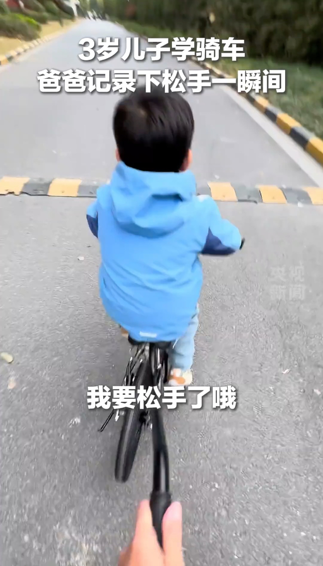 爸爸教3岁儿子学骑自行车,追在身后“疯狂”夸奖
