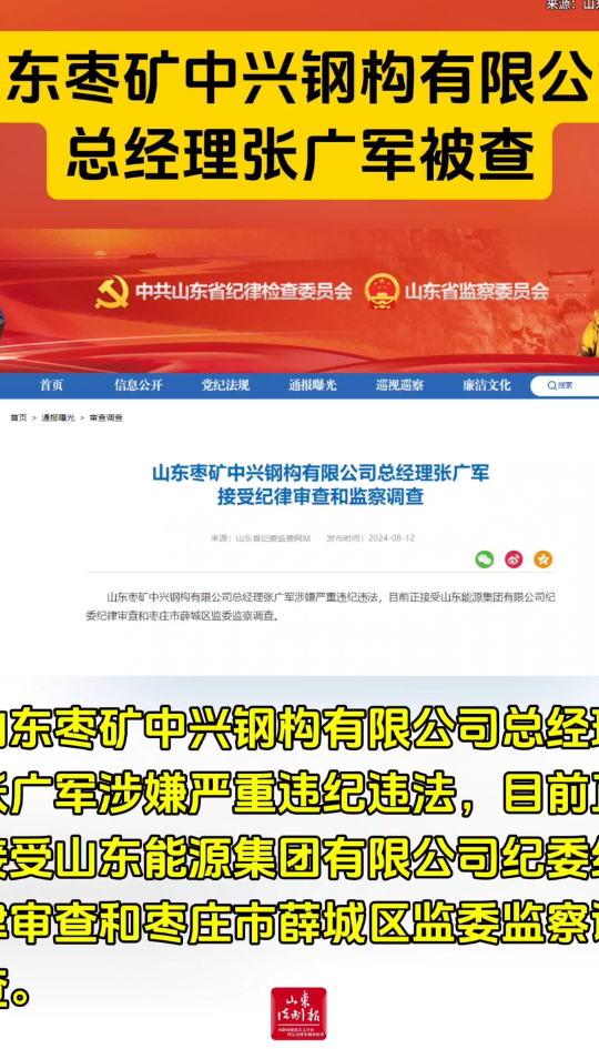 山东枣矿中兴钢构有限公司总经理张广军接受纪律审查和监察调查