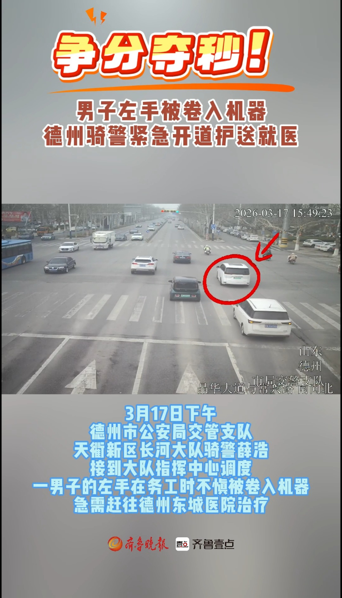 争分夺秒!男子左手被卷入机器,德州骑警紧急开道护送就医