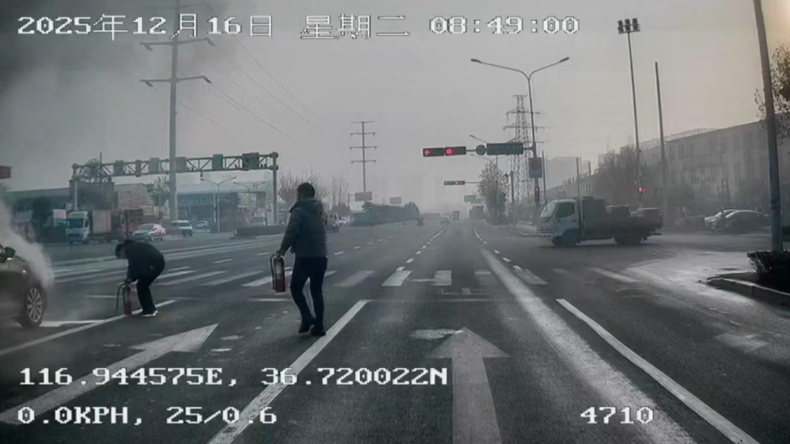 早高峰私家车冒起浓烟,公交司机和乘客拿起灭火器就冲了上去