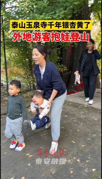 果然视频|泰山玉泉寺千年银杏黄了,外地游客抱娃登山