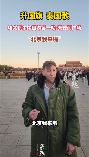 果然视频|北京我来啦,埃文凯尔中国游第一站来看升国旗